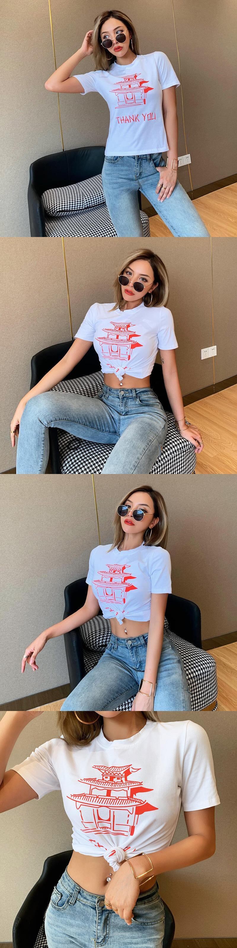 スリムラウンドネックトップス レディーストレンド半袖スリーブプリント ショート ハーフスリーブ Oネック Tシャツ ヨーロピアン YU84062777427