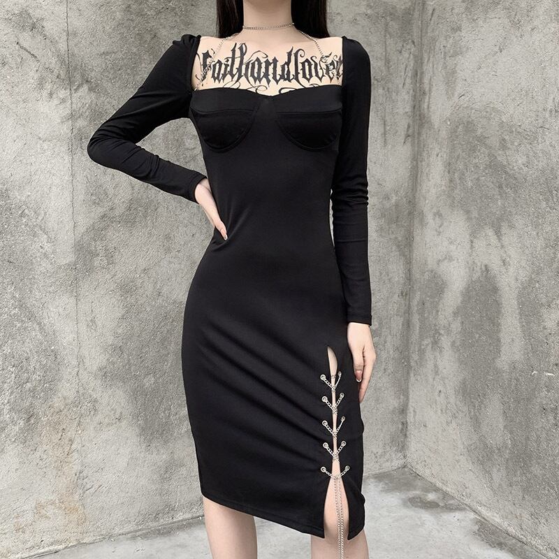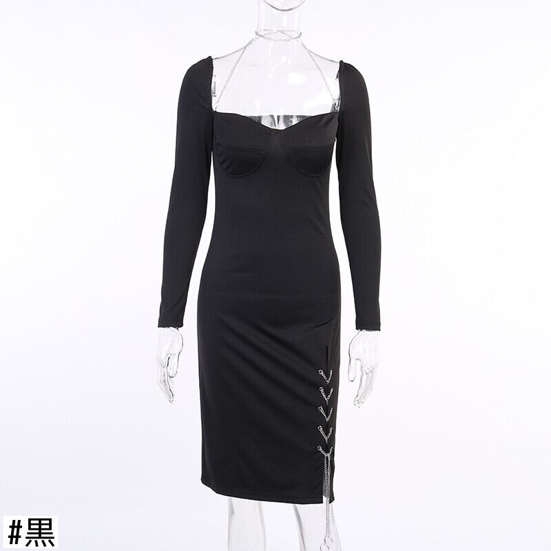 ダークブラックワンピース薄手メタルロングスカート ペンダント YU33141336314