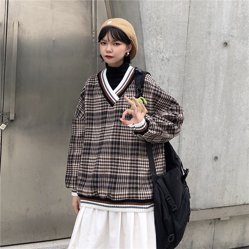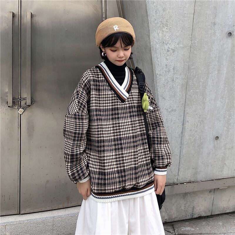 秋物ジャケット レディース韓国ファッショントレンドスタンダード格子柄Vネックルーズプルオーバー セーター ロング レトロ オータム スタイル 長袖 デーモン4872009715