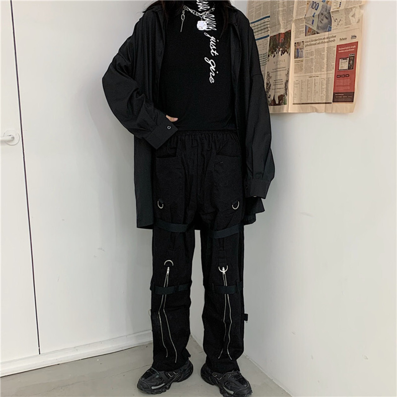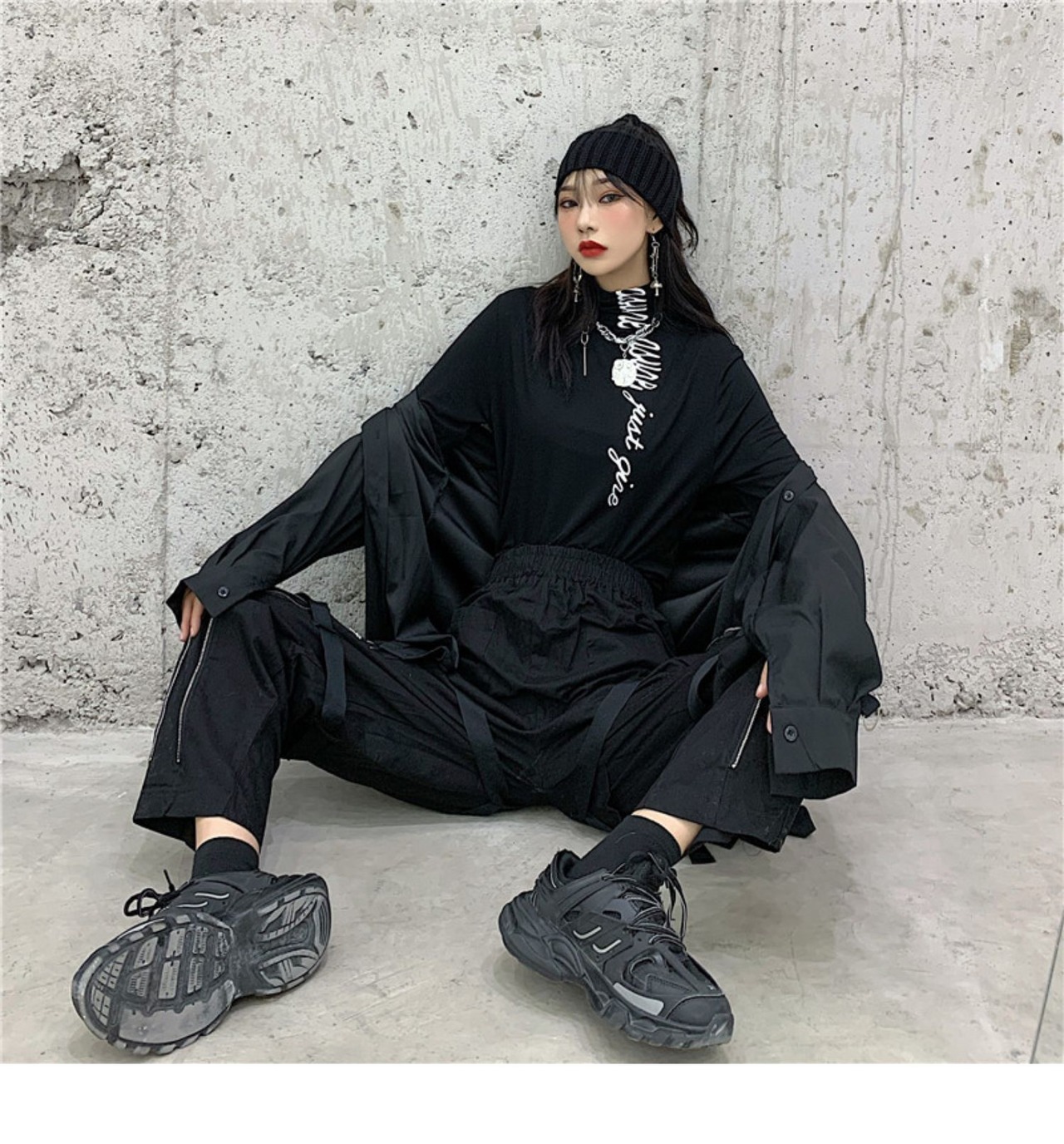 ブラックゆったりシャツ 秋物韓国ファッショントレンドスリムTシャツ ロング オータム ボーイズ スタイル 長袖 デーモン33474699350