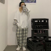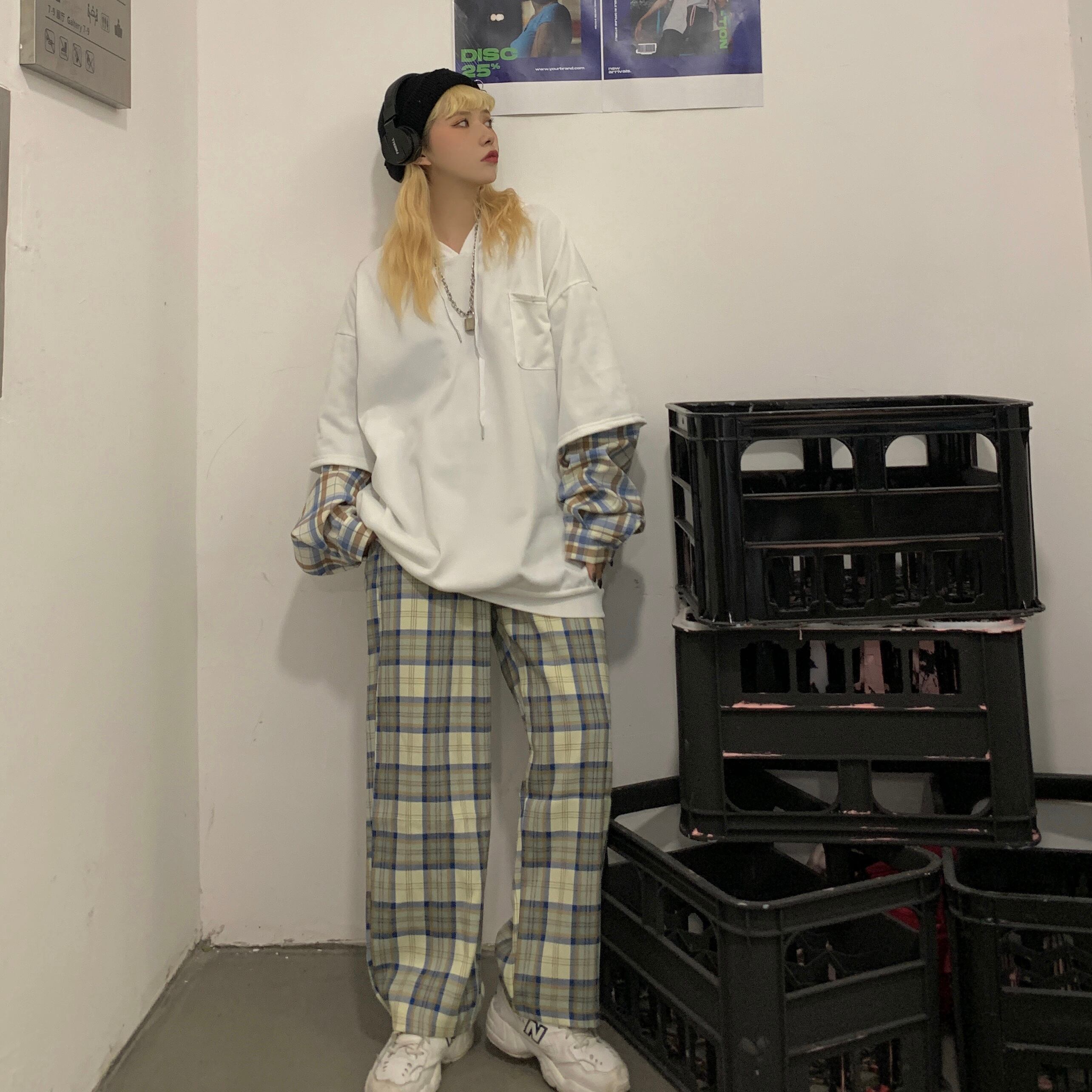 トップス 韓国ファッショントレンド格子柄ルーズフードセーター ロング ステッチ スタイル 長袖 デーモン10315331079