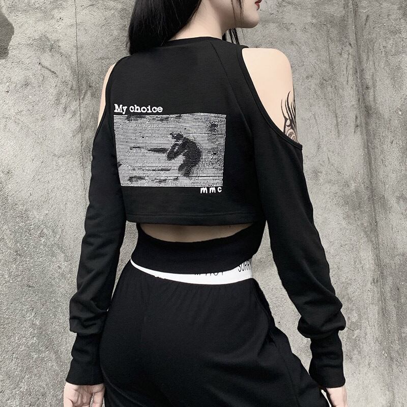ラウンドネックラインストーンプリントセーター ゆったりシャツ レディース ロング Oネック オフショルダー 長袖 YU35811791469