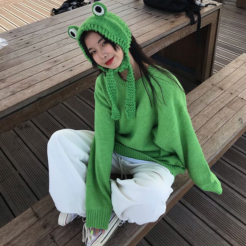 色:アップルグリーンのセータープルオーバー,ホワイトコーデュロイパンツS,カエルの帽子,ホワイトコーデュロイパンツM,ホワイトコーデュロイパンツL
