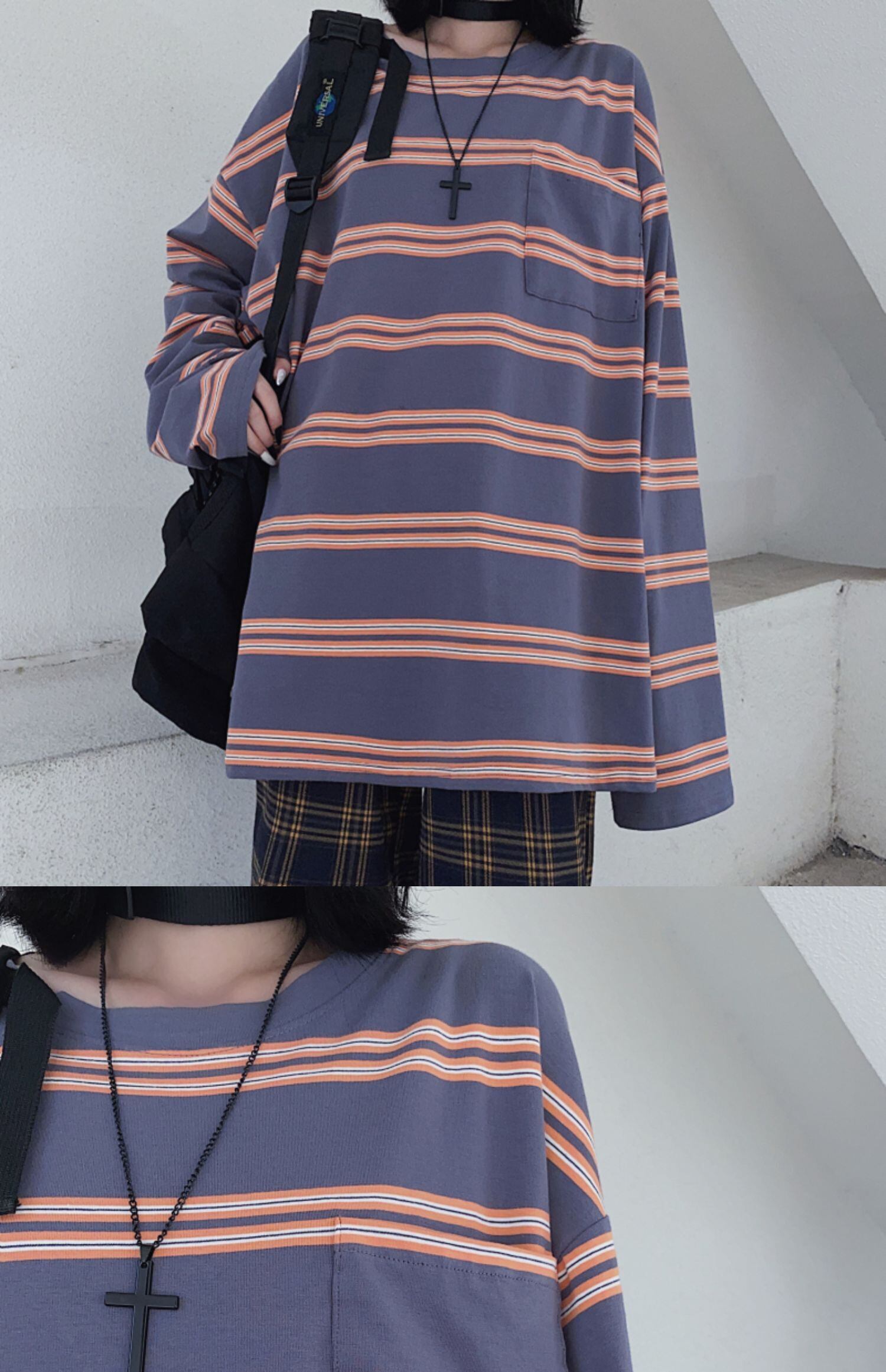 Tシャツシャツ レディース秋物韓国ファッショントレンドスタイルストライプラウンドネックルーズ ロング オータム Oネック ボーイズ 長袖 デーモン30532217999