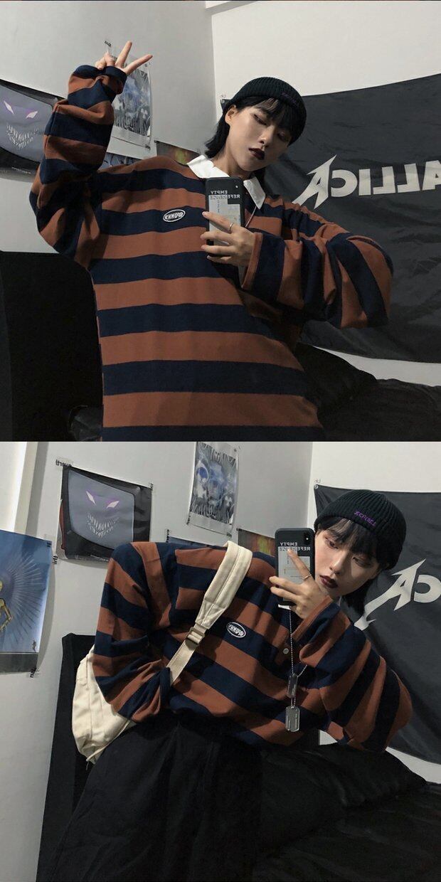 Tシャツシャツ レディース秋物韓国ファッショントレンドスタンダードストライプルーズカラートップス ロング レトロ オータム スクウェア スタイル 長袖 デーモン75392761211