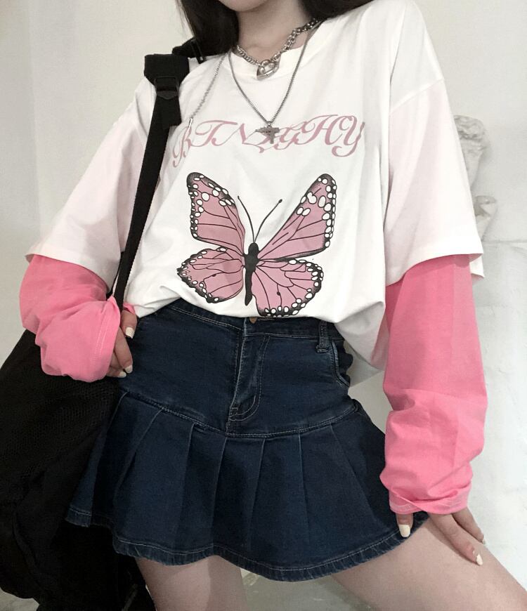 Tシャツレディース秋物韓国ファッショントレンドスタンダードButterflyデザイン プリントゆったりルーズトップス ロング レトロ オータム スタイル 長袖 デーモン82054392352
