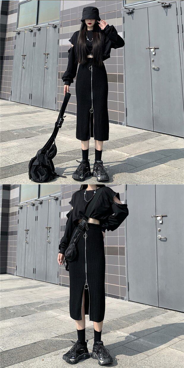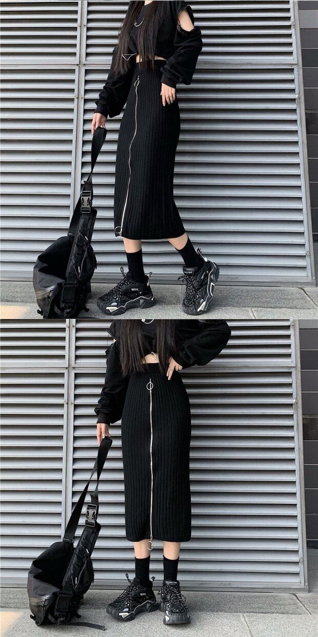 スカート レディース秋物韓国ファッショントレンドスタンダードブラックニット レトロ オータム スタイル ミドル丈 デーモン54723778895