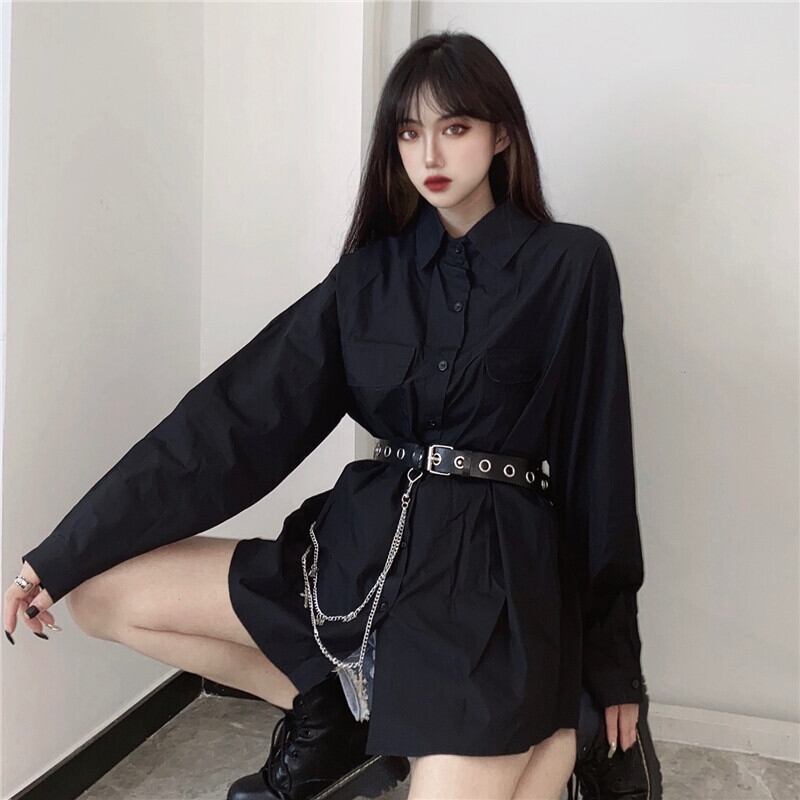 シャツ レディース秋物韓国ファッショントレンドスタイルルーズトップス ロング 原宿 オータム 長袖 ミドル丈 デーモン95013779872