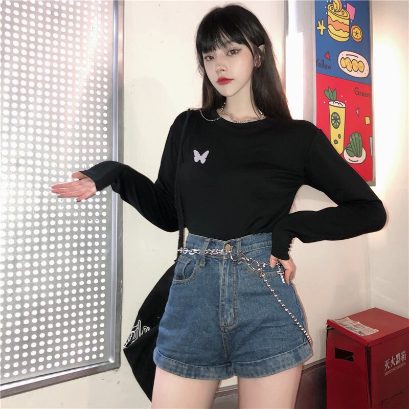 Tシャツシャツ トップス 秋物韓国ファッショントレンドButterflyデザイン 刺繍ショートスリムゆったり ロング オータム スタイル 長袖 デーモン86659776872