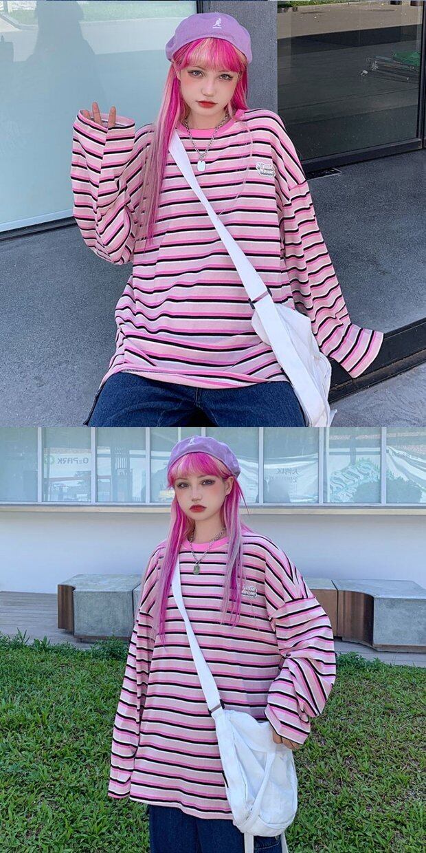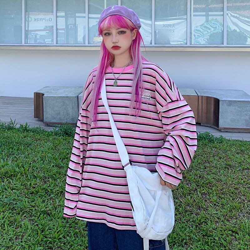 ストライプTシャツシャツ 秋物韓国ファッショントレンドスタンダードゆったりルーズラウンドネックトップス ロング レトロ オータム Oネック スタイル 長袖 デーモン11445171491