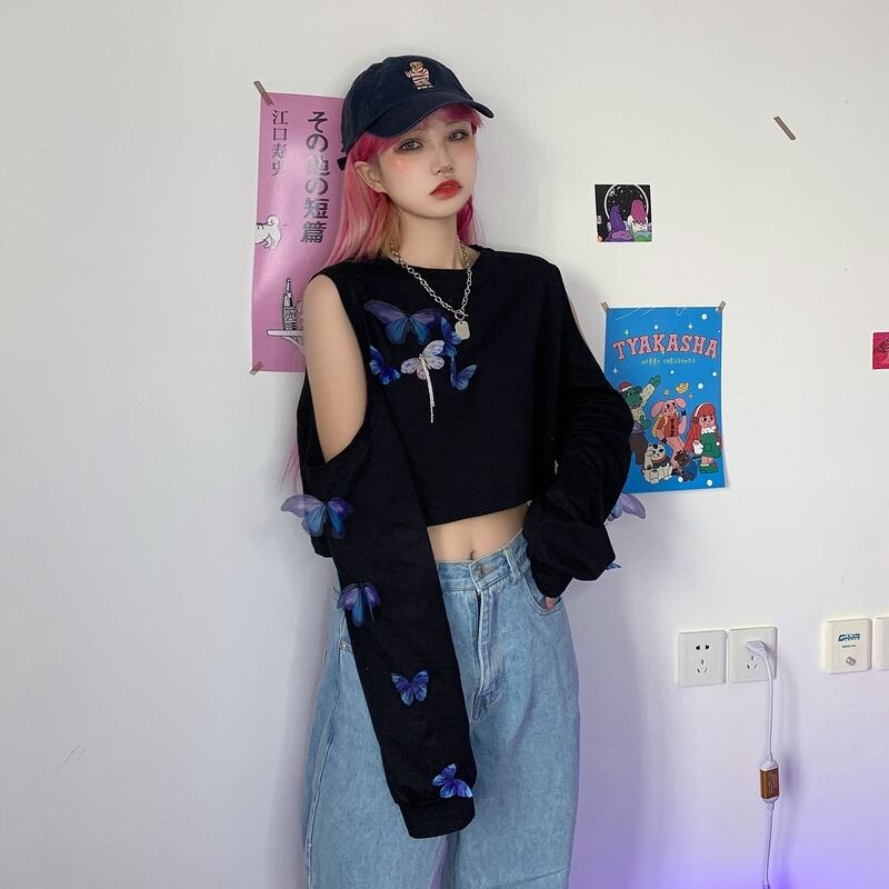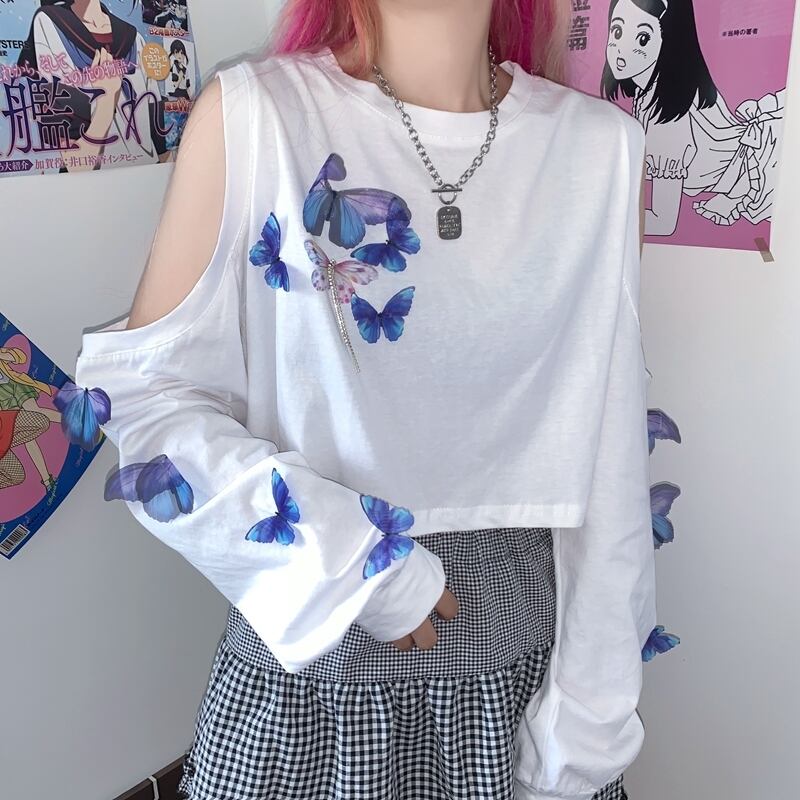 ストラップレスTシャツ秋物韓国ファッショントレンドButterflyデザイン ホワイトゆったりショートルーズトップス ロング オータム 長袖 デーモン69989501641