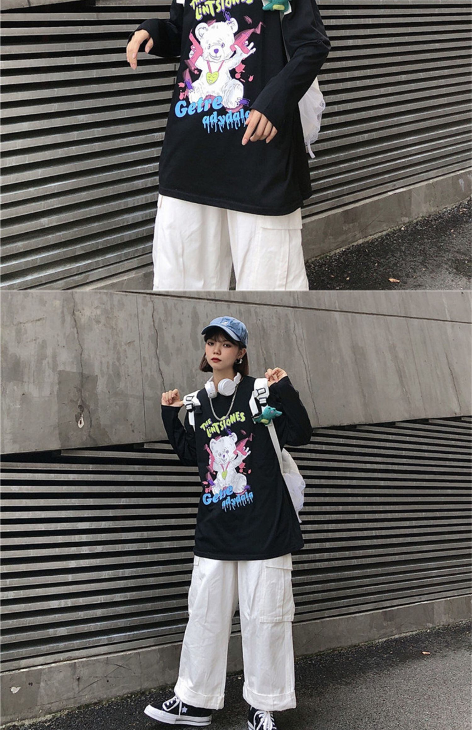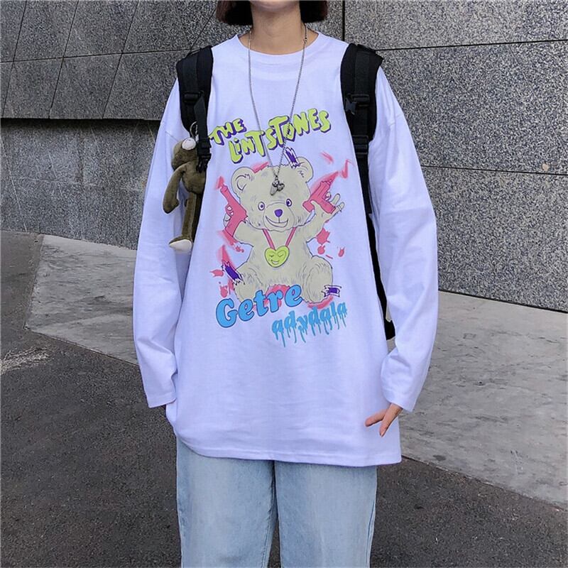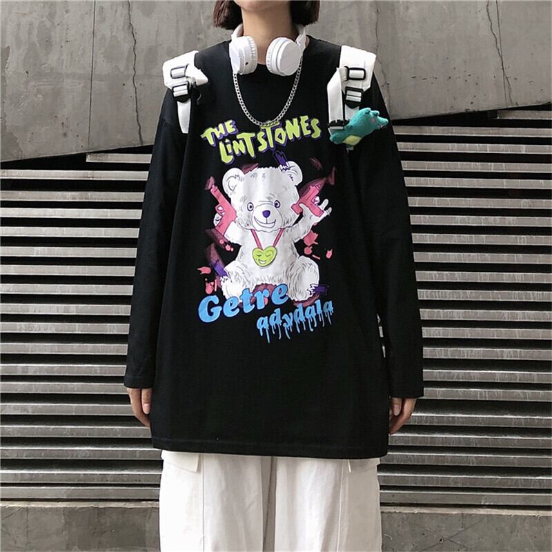 Tシャツシャツ レディース秋物韓国ファッショントレンドスタンダードプリント柄ゆったりブラックルーズトップス ロング レトロ オータム スタイル 長袖 デーモン78291924185