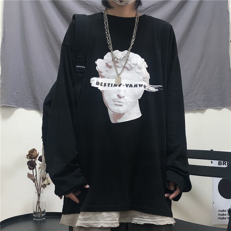 Tシャツレディース秋物韓国ファッショントレンドスタイルスタンダードプリントブラックルーズトップス ロング レトロ 原宿 オータム 長袖 デーモン82617091142