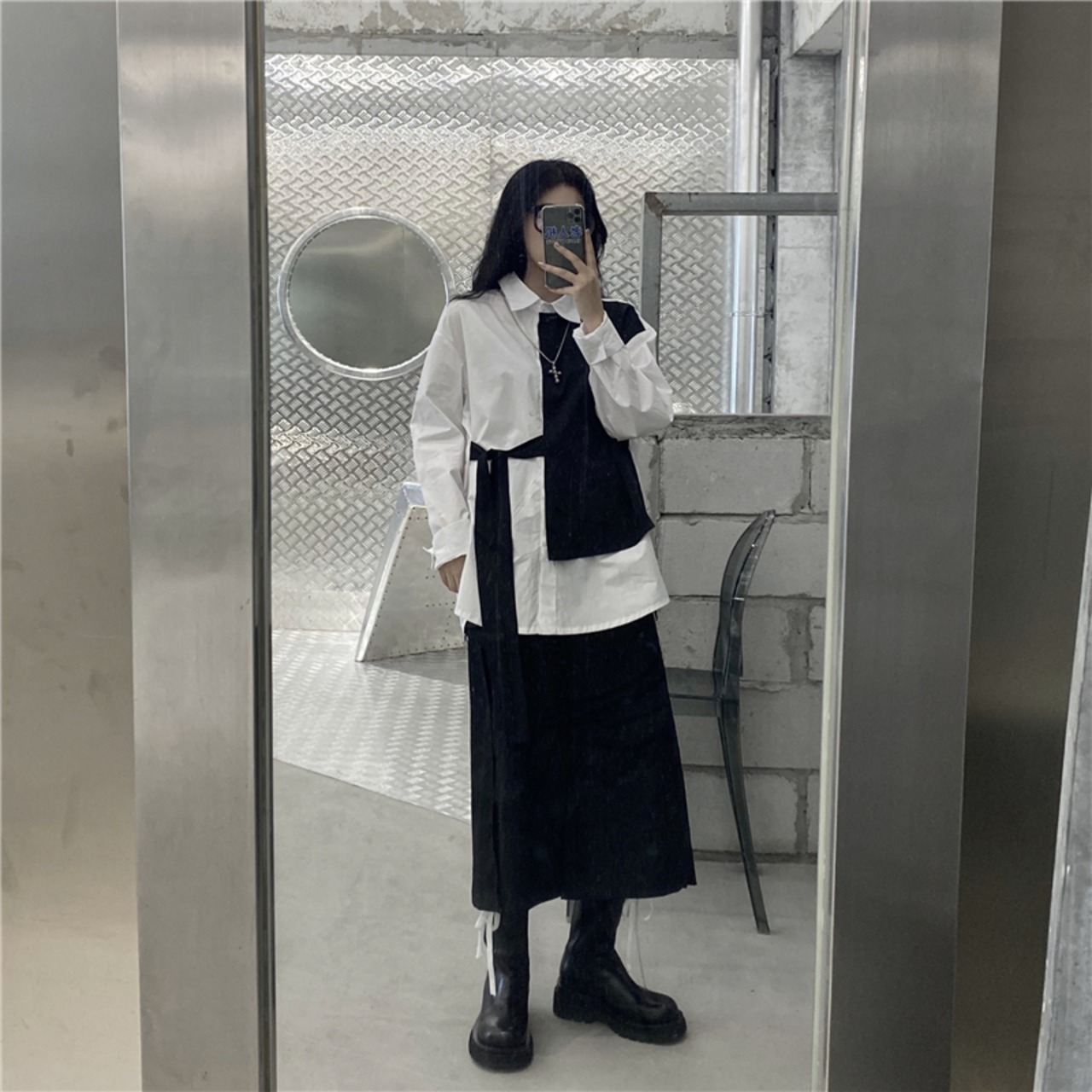 トップス 秋物レディース韓国ファッショントレンドブラックホワイトルーズシャツ ロング オータム ステッチ スタイル 長袖 デーモン31959528508