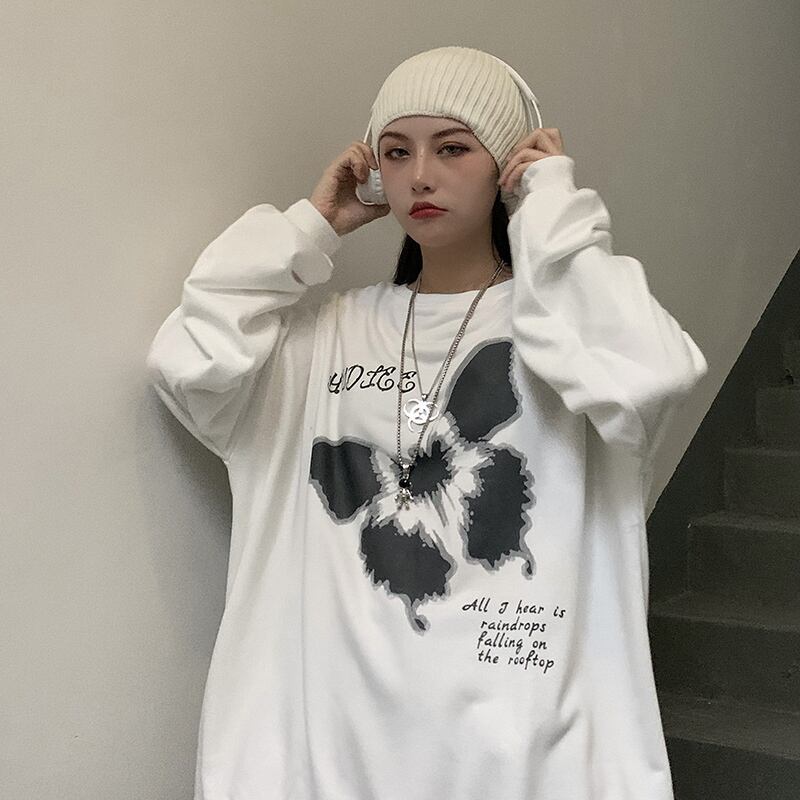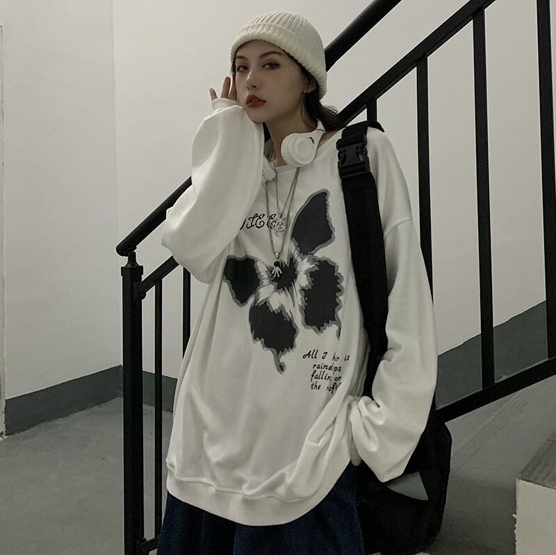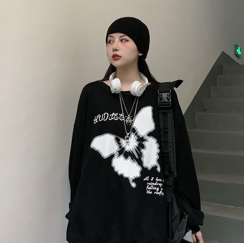 秋物薄手トレンド韓国ファッションButterflyデザイン プリント柄セーター ブラックルーズトップス ロング オータム ボーイズ スタイル 長袖 デーモン37871549879