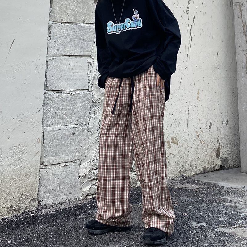 格子柄パンツ レディーストレンド韓国ファッションスタンダードワイドレッグハイウェストウェストルーズスリムカジュアル ピンク レトロ ワイドパンツ ウエスト デーモン81788628973