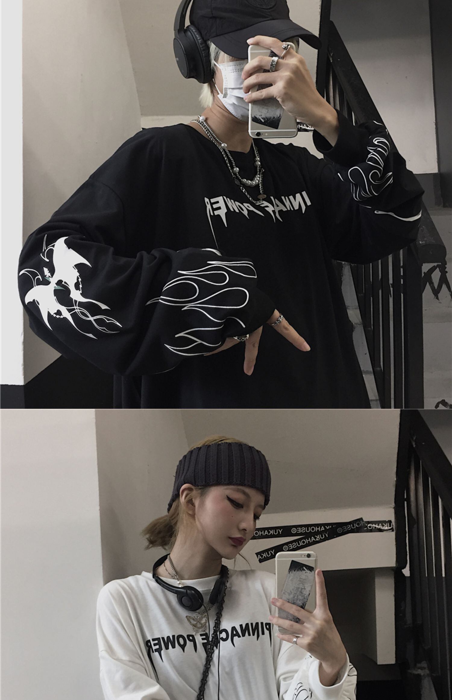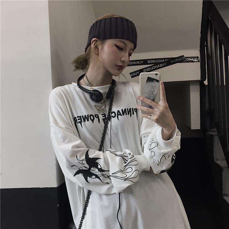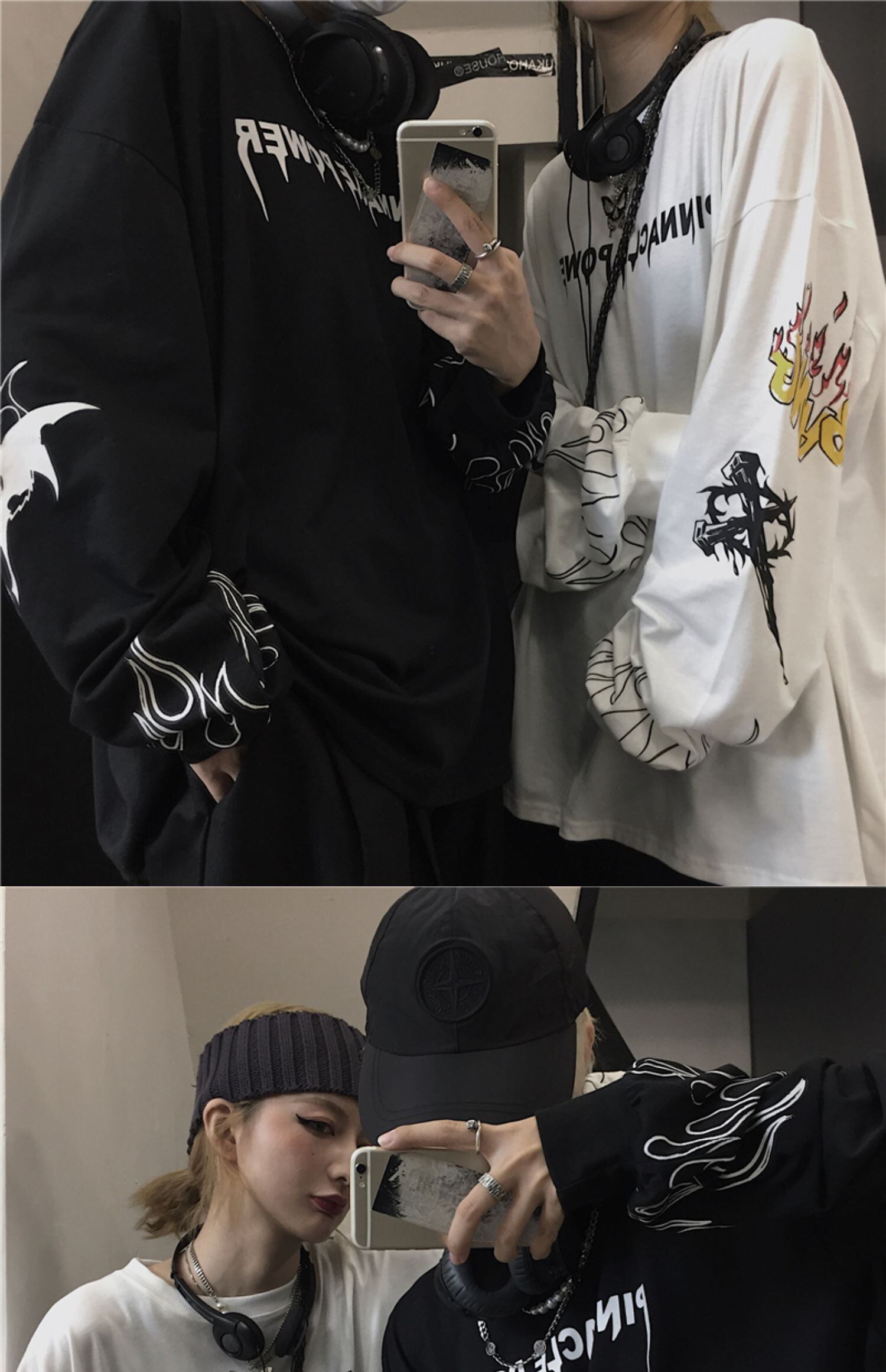 トップス 秋物韓国ファッショントレンドダークプリントルーズラウンドネックTシャツ ロング オータム Oネック スタイル 長袖 デーモン85427426492