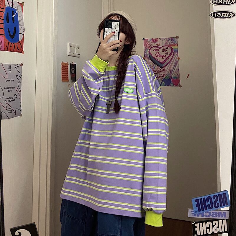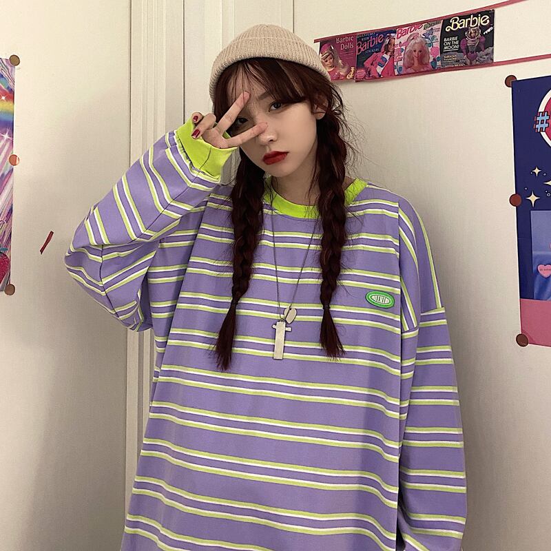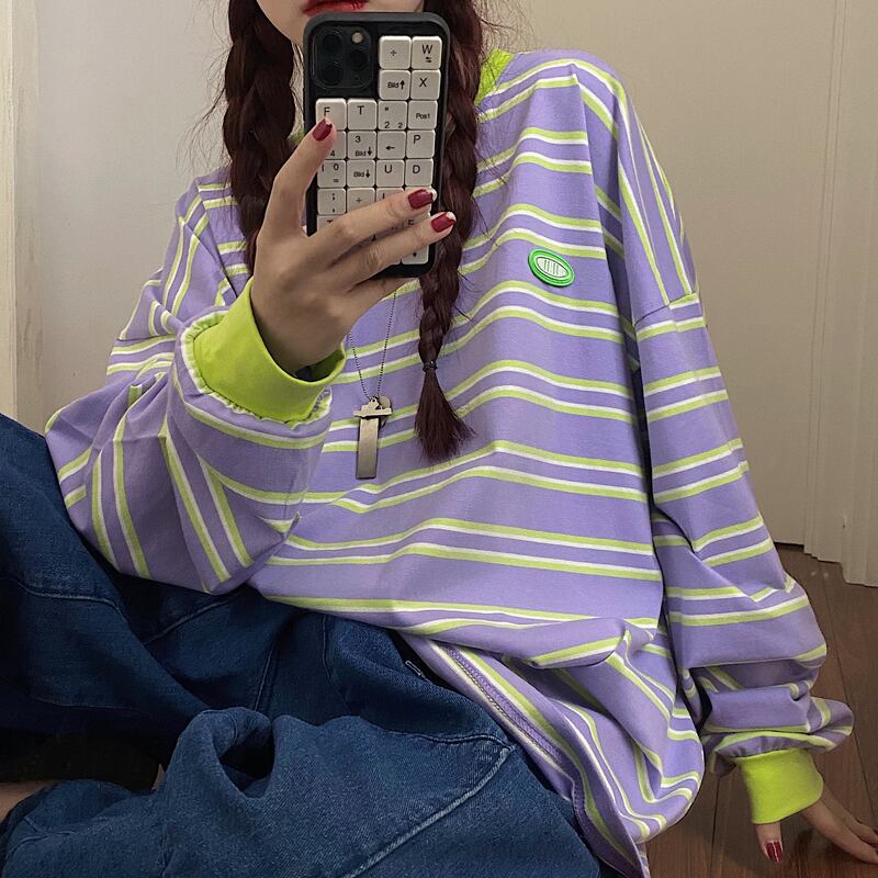 セーター レディース秋物韓国ファッショントレンドストライプトップス ルーズプルオーバー ジャケット ロング オータム 長袖 デーモン78125385349