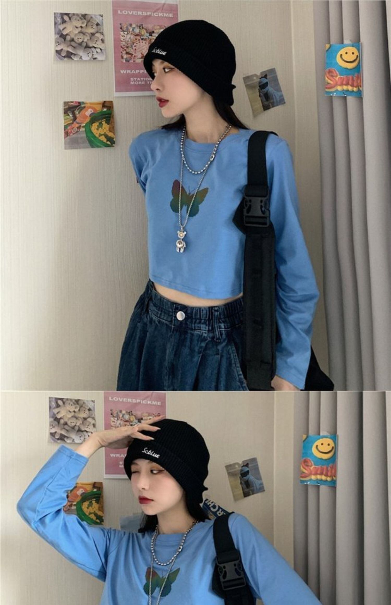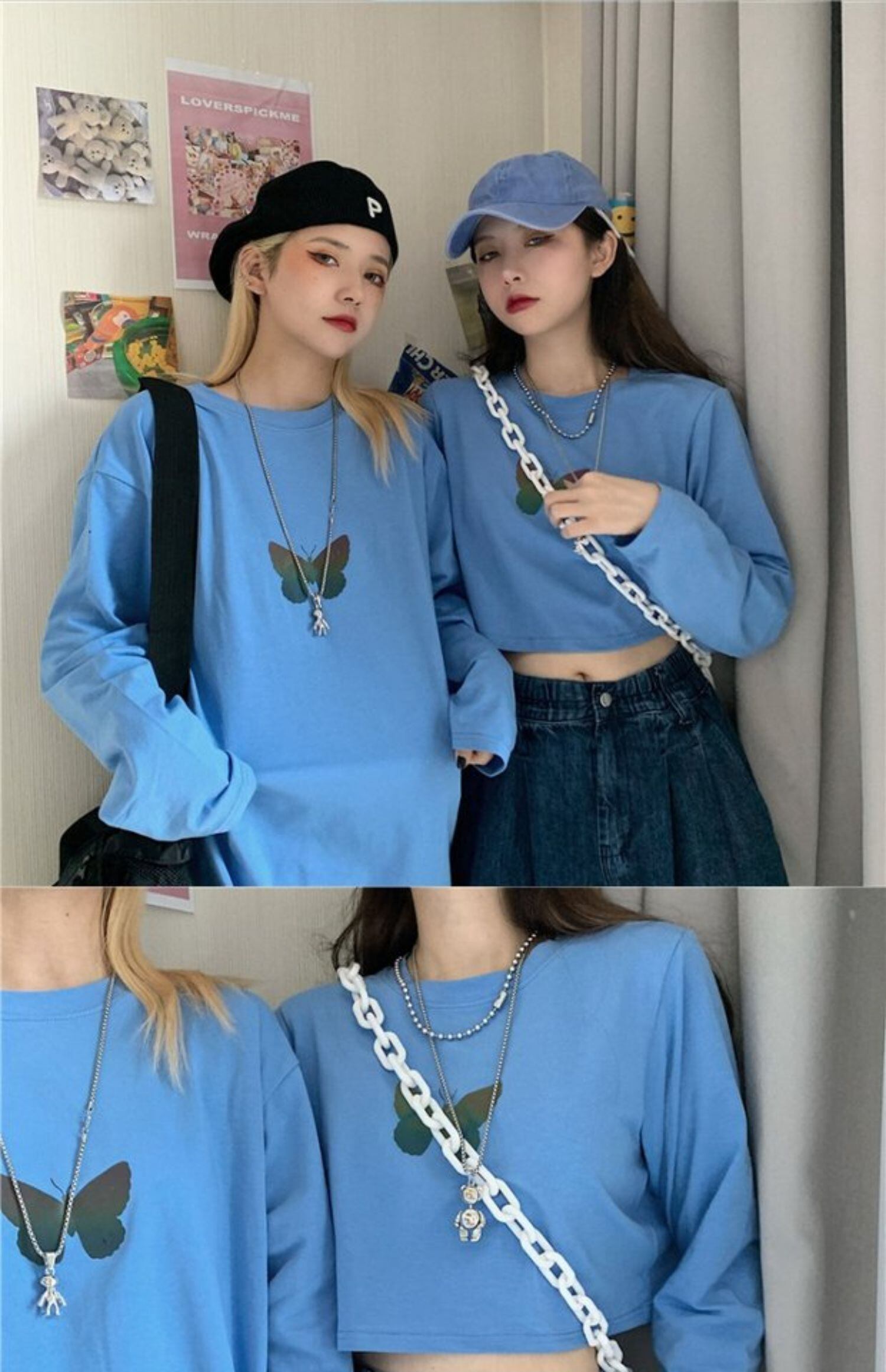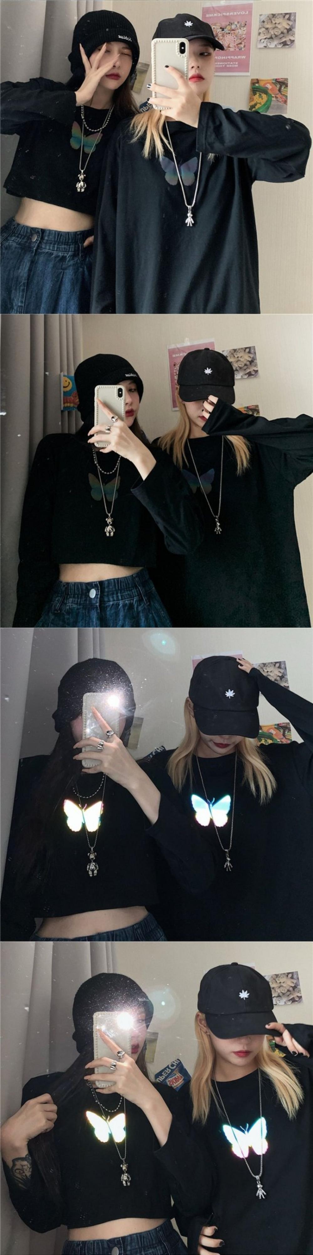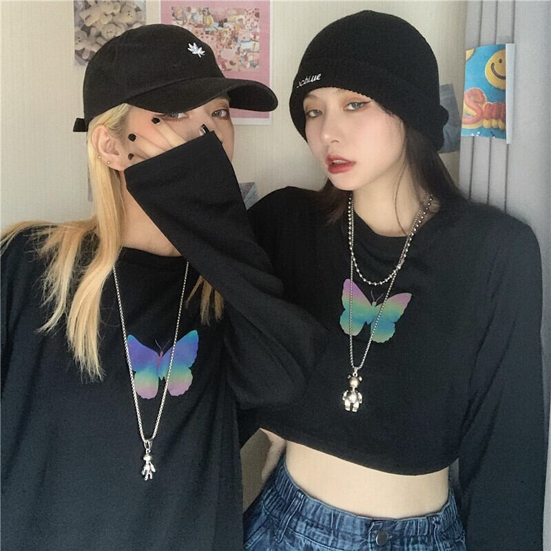Tシャツ秋物韓国ファッショントレンドButterflyデザイン プリントルーズショートホワイトトップス ロング オータム ボーイズ スタイル 長袖 デーモン66650831202