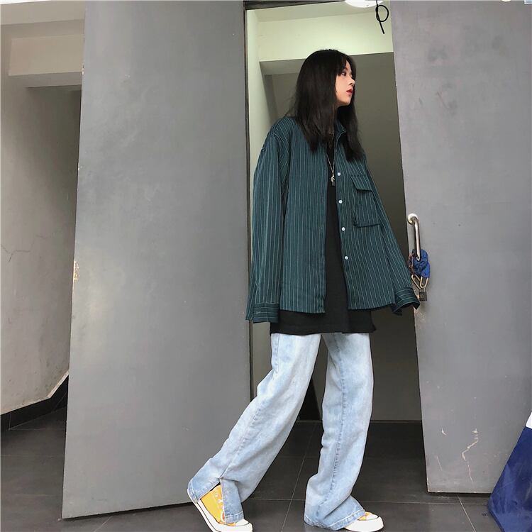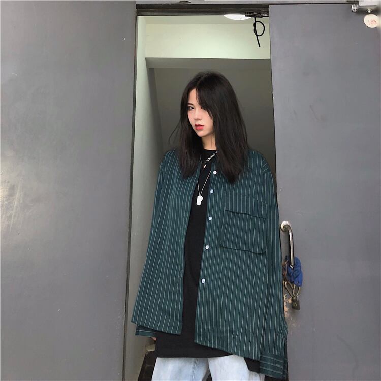 シャツ レディース秋物トレンド韓国ファッションストライプカラールーズブラックトップス コート ロング オータム スクウェア スタイル 長袖 デーモン96563309078