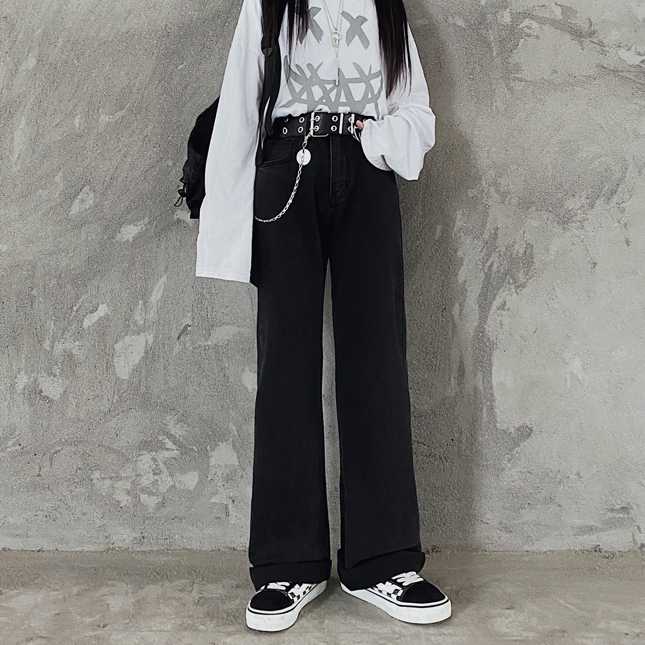ブラックジーンズ レディース韓国ファッショントレンドハイウェストウェストルーズ薄手カジュアルパンツ ボーイズ スタイル ウエスト デーモン53360250310