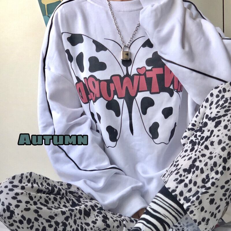 秋物レディース韓国ファッショントレンドスタイルButterflyデザイン ラウンドネックルーズ長袖スリーブプルオーバー セーター ロング 原宿 オータム Oネック デーモン30759087908