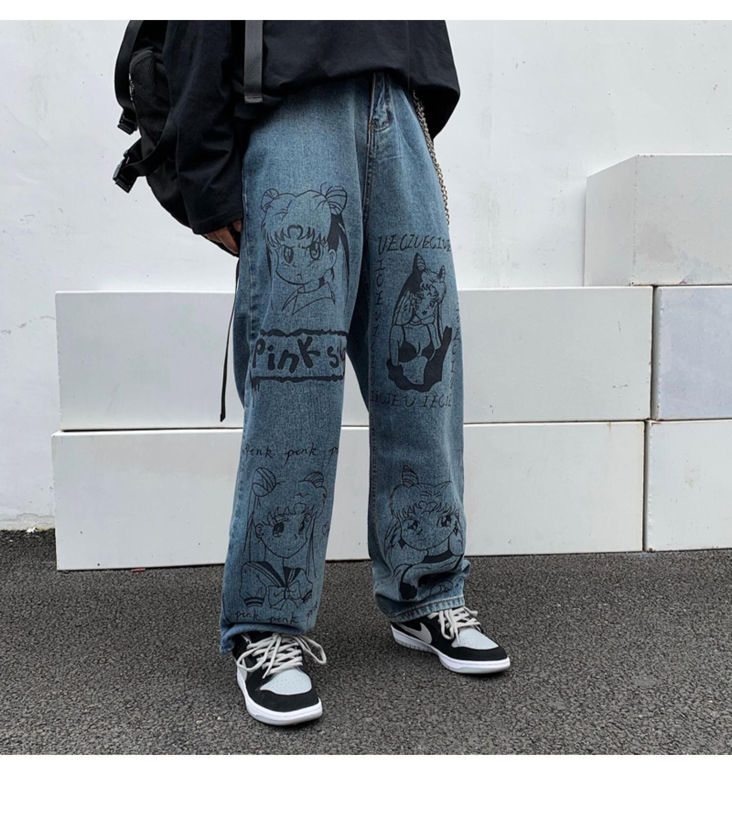 ウェストスリムジーンズ レディース韓国ファッショントレンドスタンダードプリントルーズパンツ レトロ スタイル ウエスト デーモン93475982418