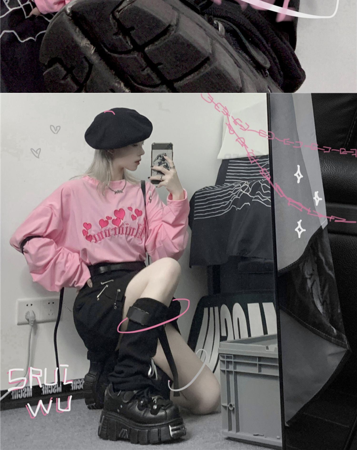 Tシャツシャツ 秋物韓国ファッショントレンドスタンダードプリント柄ルーズ ロング ピンク レトロ オータム スタイル 長袖 デーモン23747213684