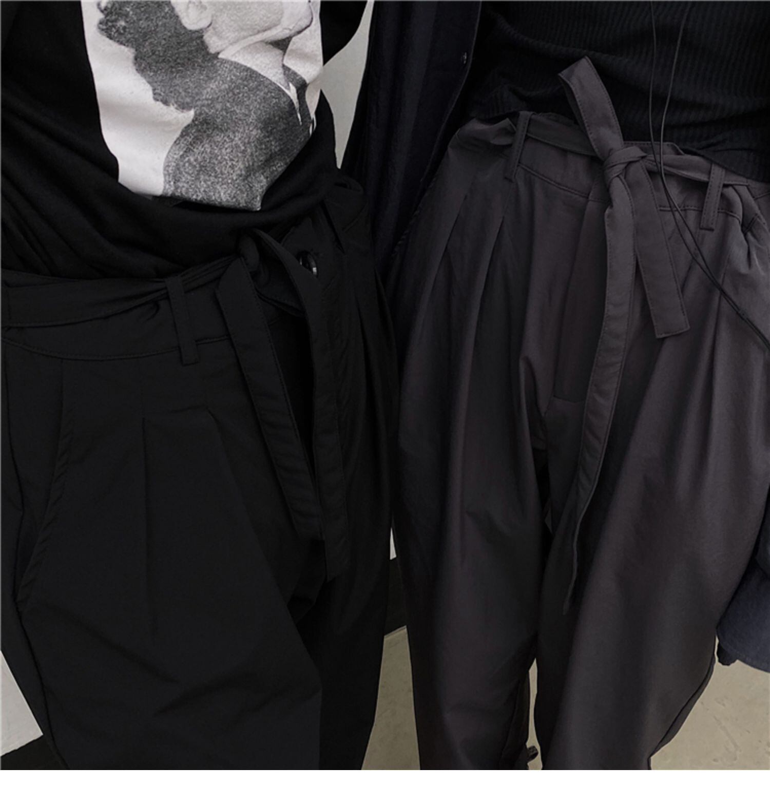 パンツ 韓国ファッショントレンドルーズワイドレッグハイウェストウェストギャザーブラック ワイドパンツ スタイル ウエスト デーモン34502641989
