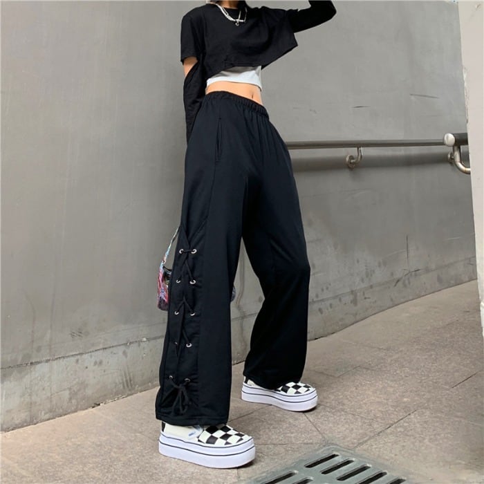 パンツ レディース韓国ファッショントレンドギャザーブラックルーズ薄手ハイウェストウェストカジュアル スタイル ウエスト デーモン9365322373