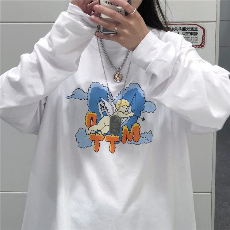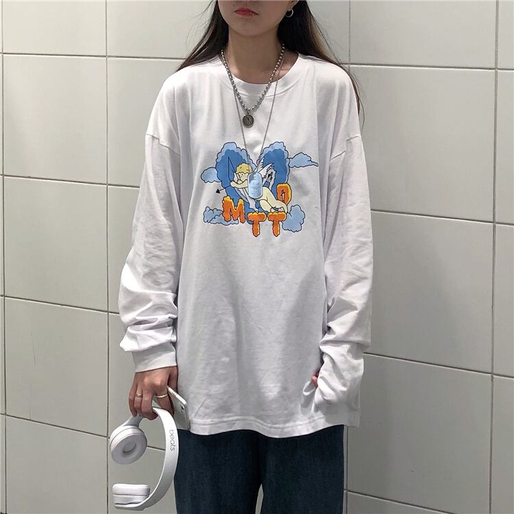 ブラウス 秋物韓国ファッショントレンドスタンダードプリント柄ルーズゆったりシャツ Tシャツ ロング レトロ オータム スタイル 長袖 デーモン50723914767