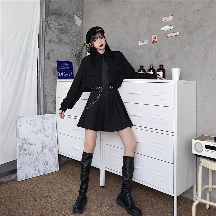 シャツ レディース秋物韓国ファッションスタンダードブラックルーズプリーツスカート ロング レトロ オータム ボーイズ 長袖 デーモン85835034980