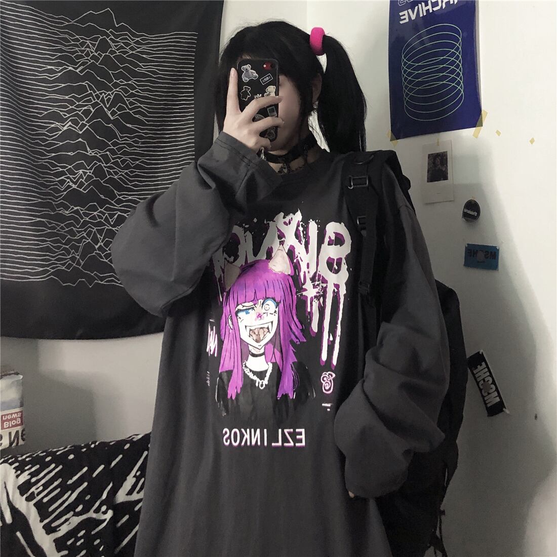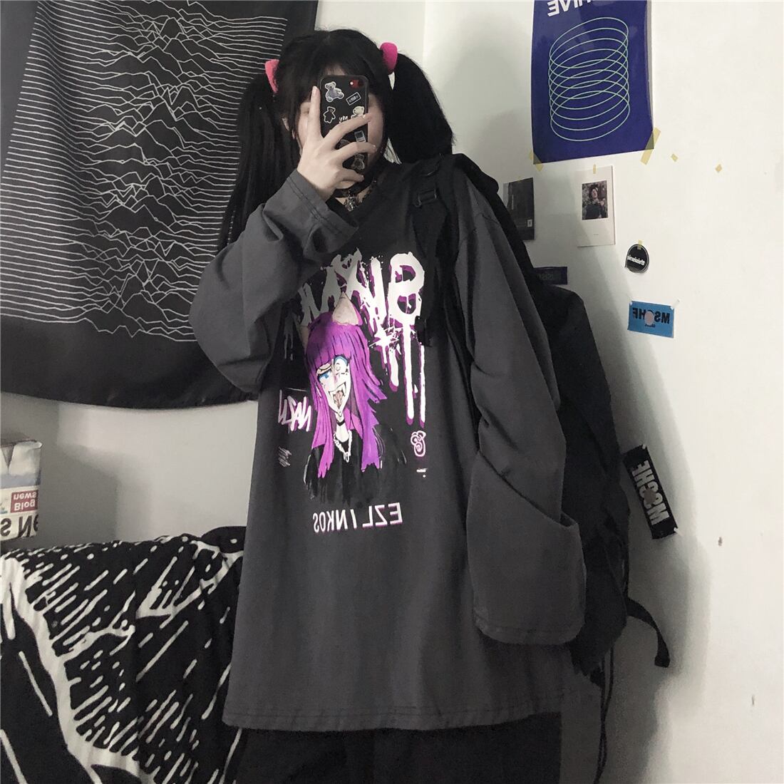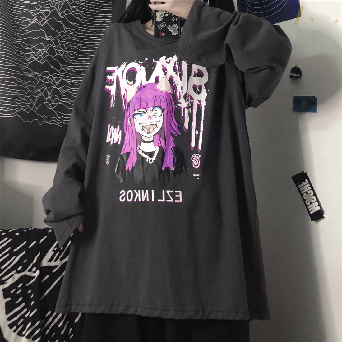 Tシャツシャツ 秋物薄手韓国ファッショントレンドプリントゆったりブラックルーズトップス ロング オータム スタイル 長袖 デーモン86163454726