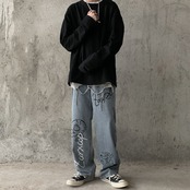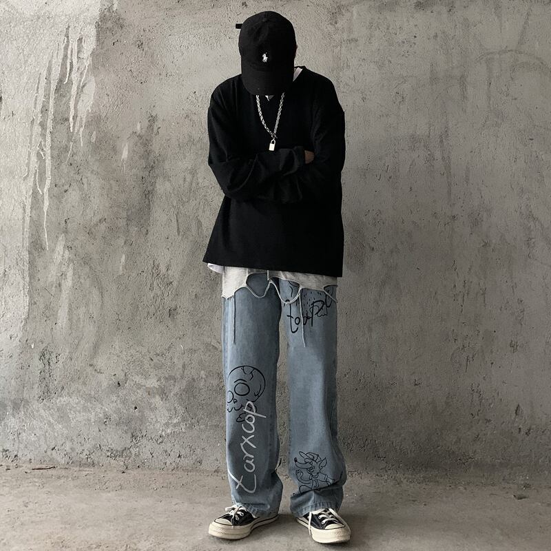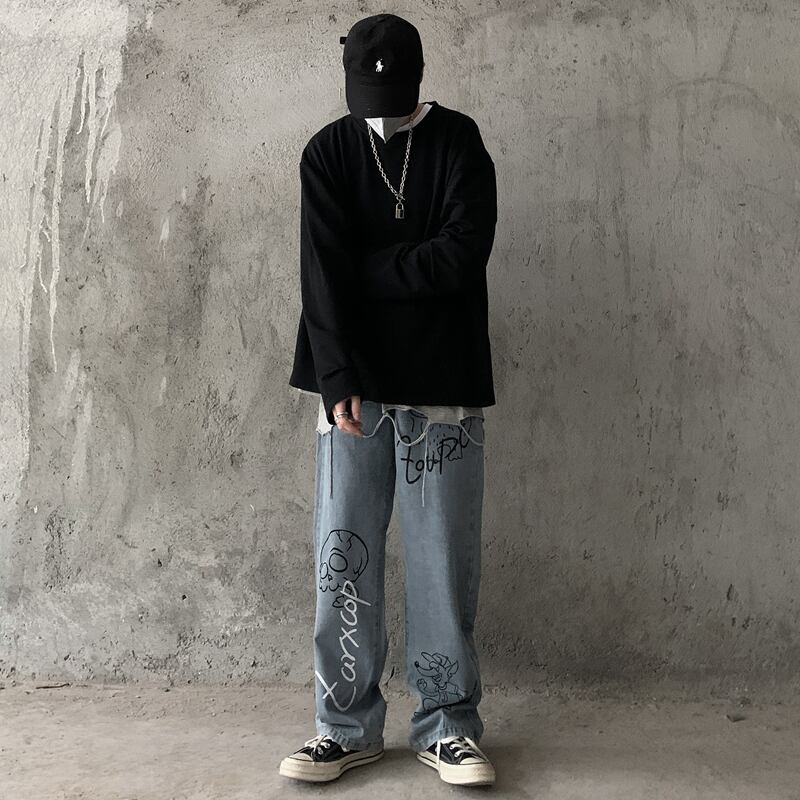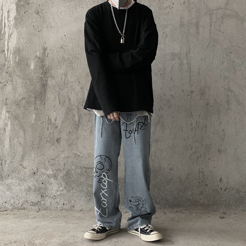 ジーンズ レディース韓国ファッショントレンドプリント柄ワイドレッグパンツ ルーズハイウェストウェストカジュアル ストリート ワイドパンツ スタイル ウエスト デーモン47173798855