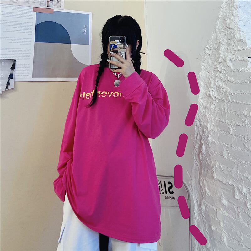 Tシャツシャツ レディース秋物韓国ファッショントレンドプリントゆったりルーズラウンドネックトップス ロング 原宿 オータム Oネック ボーイズ スタイル 長袖 デーモン30787468423