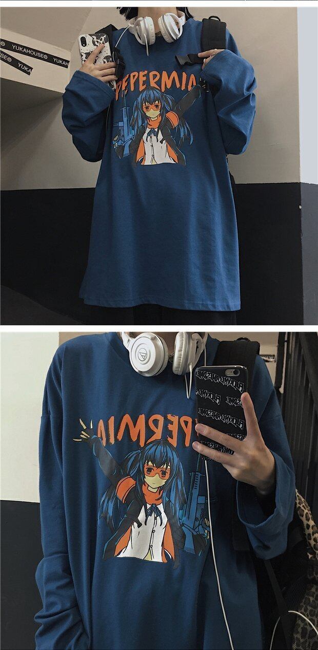 ジャケット 秋物韓国ファッショントレンドプリントルーズラウンドネックTシャツ ロング オータム Oネック スタイル 長袖 デーモン3617244279