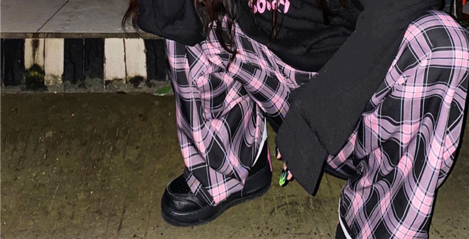 色:黒,パープルチェックパンツ