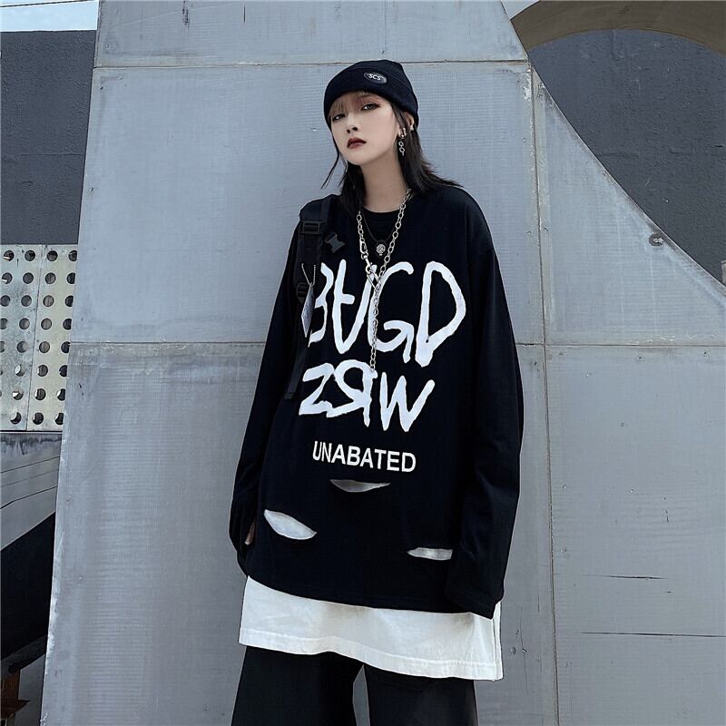 Tシャツレディース秋物韓国ファッショントレンドブラックルーズラウンドネックトップス ロング 原宿 オータム Oネック ボーイズ スタイル 長袖 デーモン72913101872