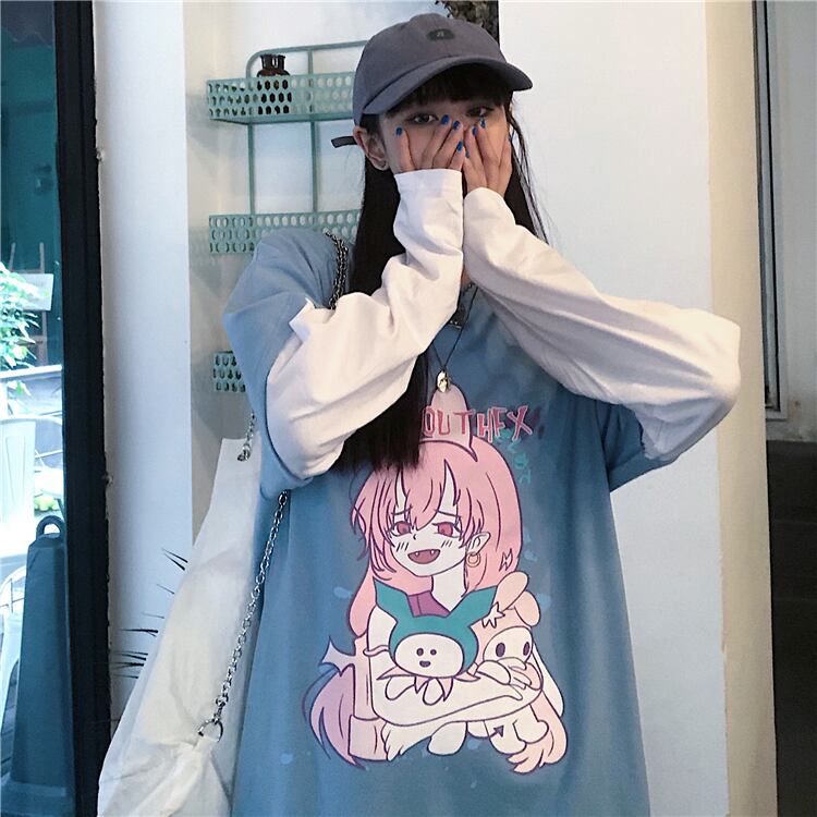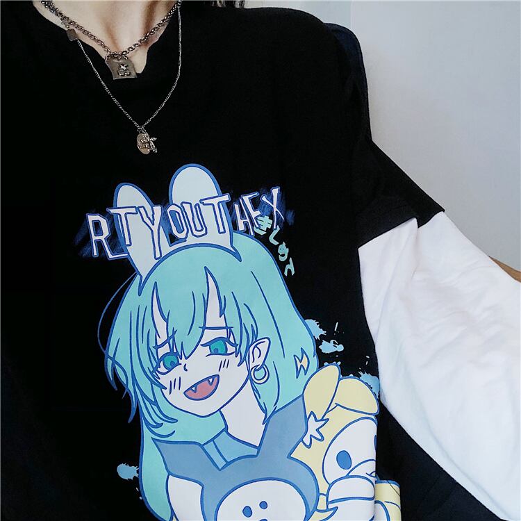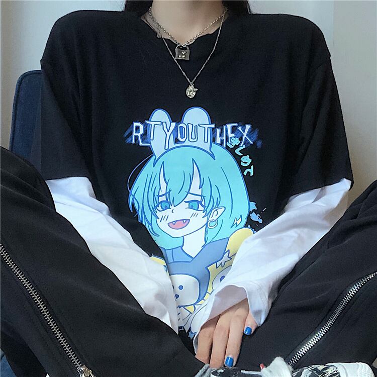 Tシャツレディース秋物トレンドプリントゆったりルーズホワイトラウンドネックトップス ロング オータム Oネック 長袖 デーモン35328387726