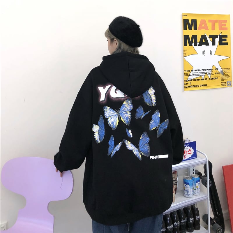 秋物ウィンタージャケット 韓国ファッショントレンドスタンダードButterflyデザイン プリント柄ルーズ厚みフードセーター レトロ オータム 冬物 ボーイズ スタイル デーモン30852009306