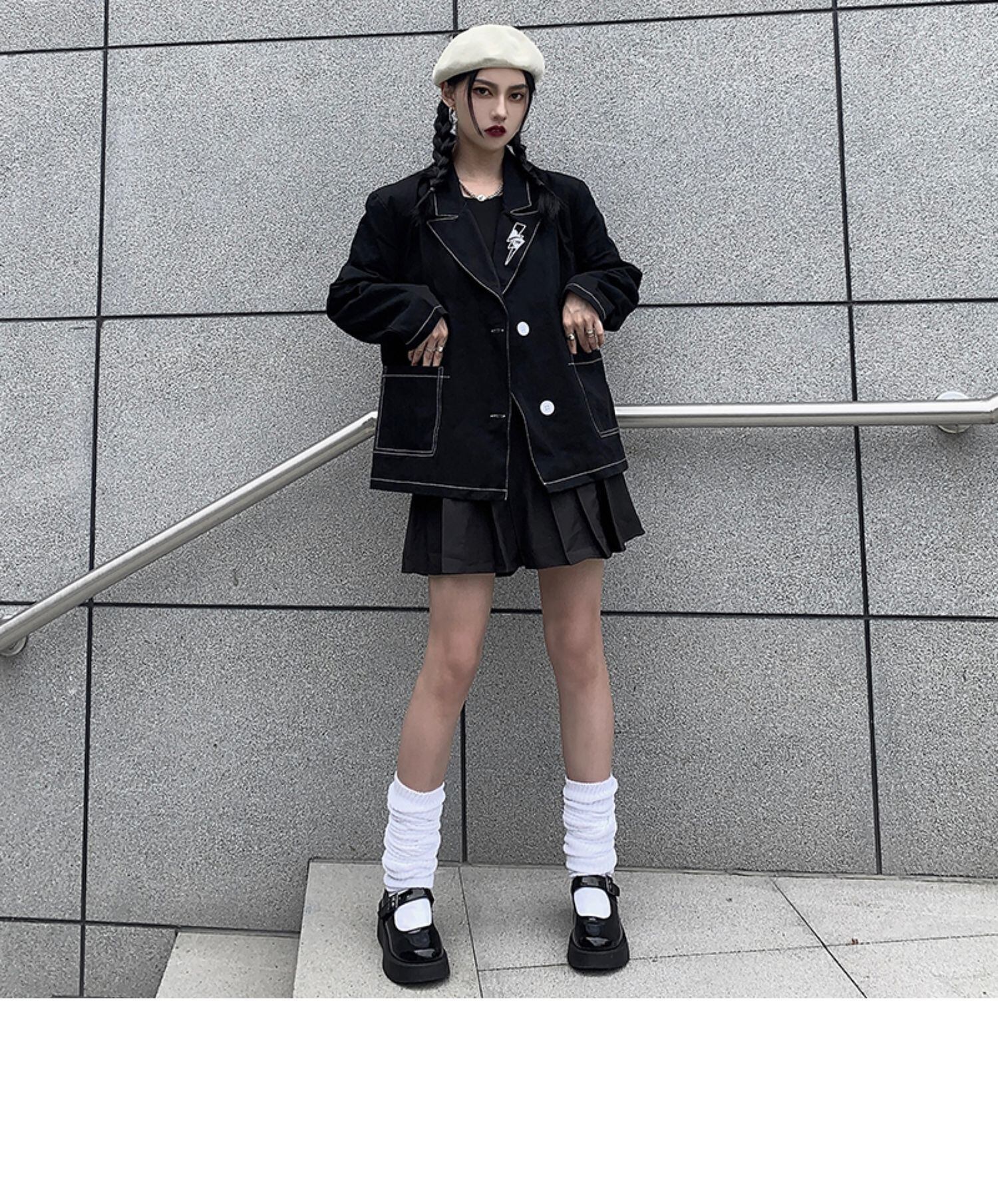 ラインブラックスタンダードジャケット レディース秋物トレンドダークルーズトップス レトロ オータム CHIL48049318938