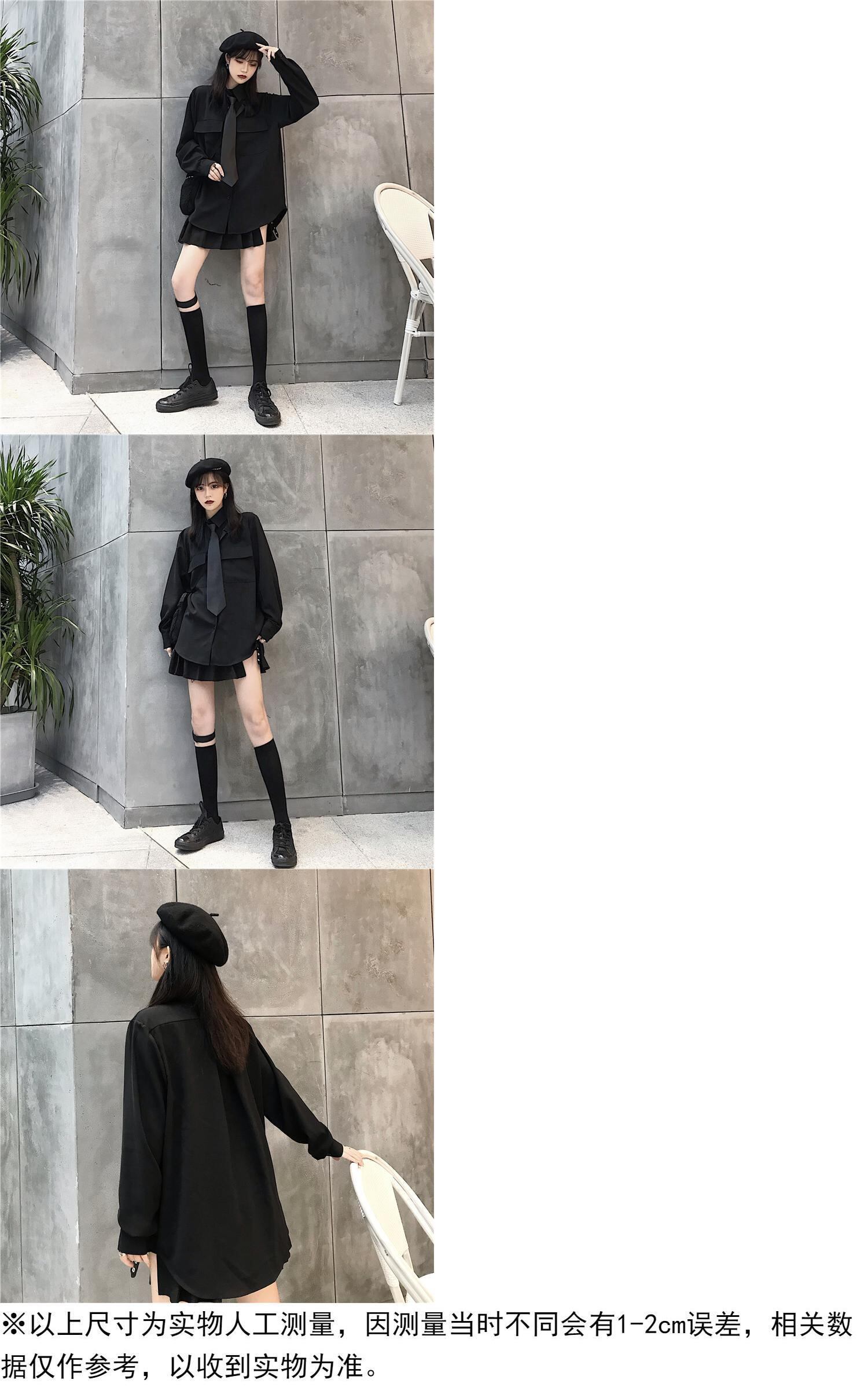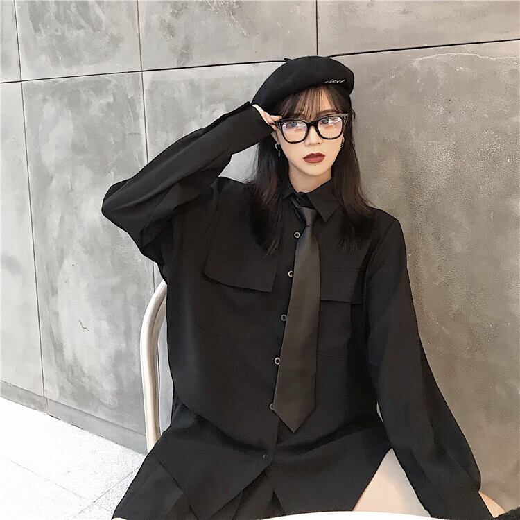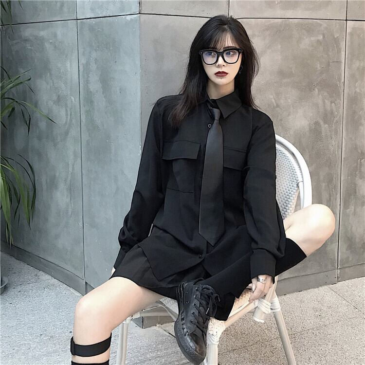 ブラックシャツ レディース韓国ファッショントレンドスタンダードダークルーズ ロング レトロ 原宿 ボーイズ スタイル 長袖 CHIL50087326577