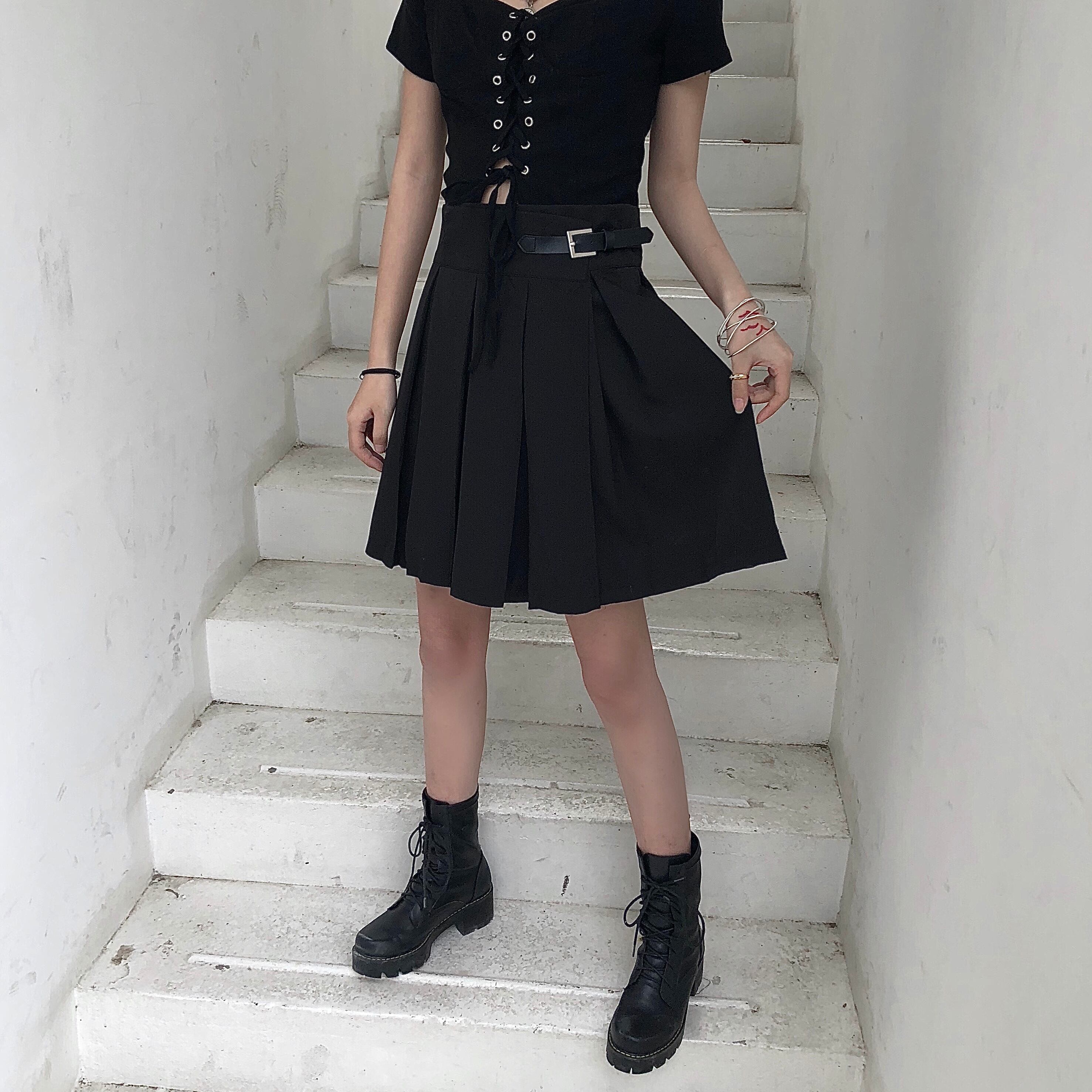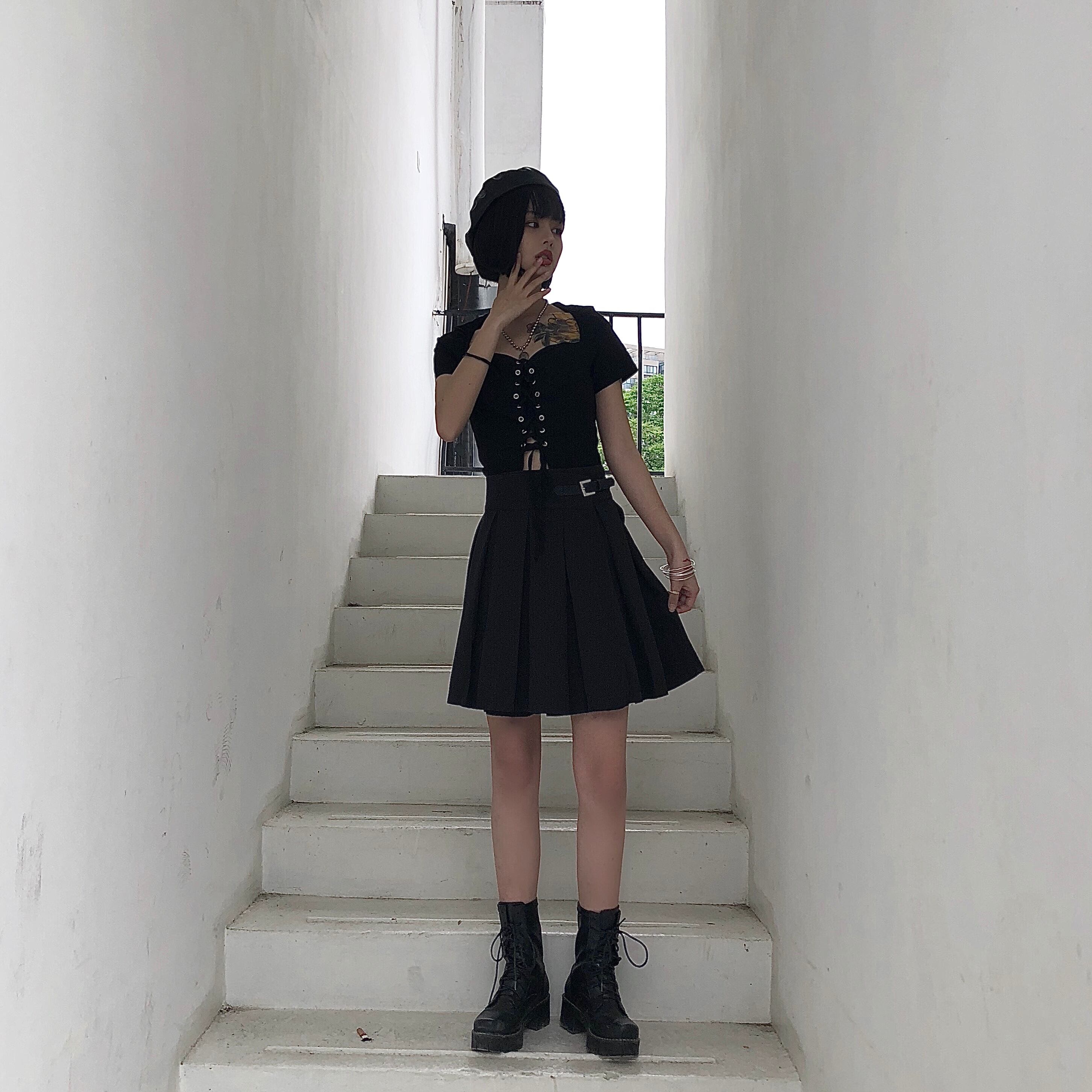 トレンドダークプリーツスカート ショート夏服ブラックワンピースAライン 夏物 CHIL16321325594