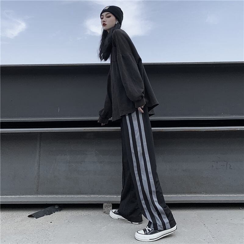 カジュアルパンツ 秋物スタイルストライプハイウェストウェストブラックルーズ オータム ウエスト CHIL3037322013