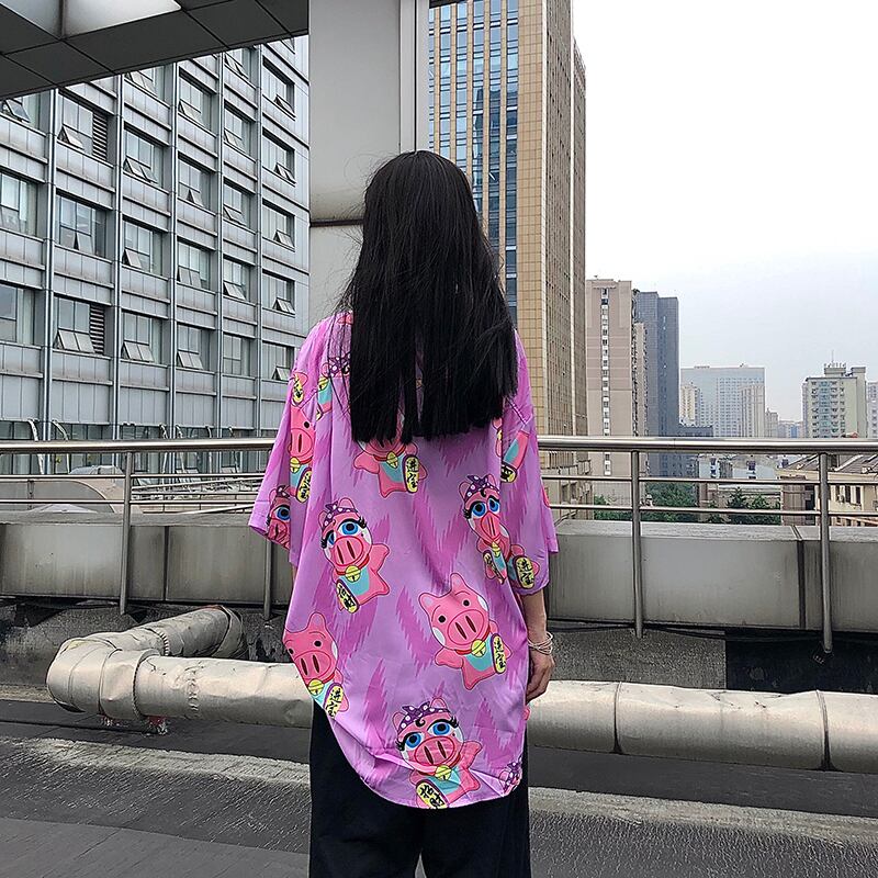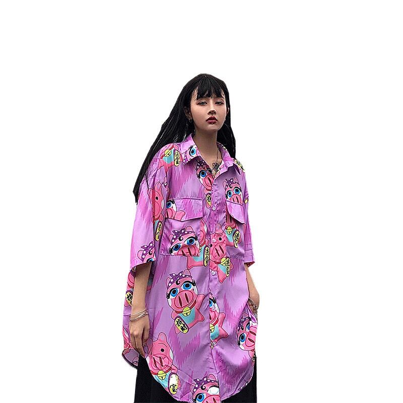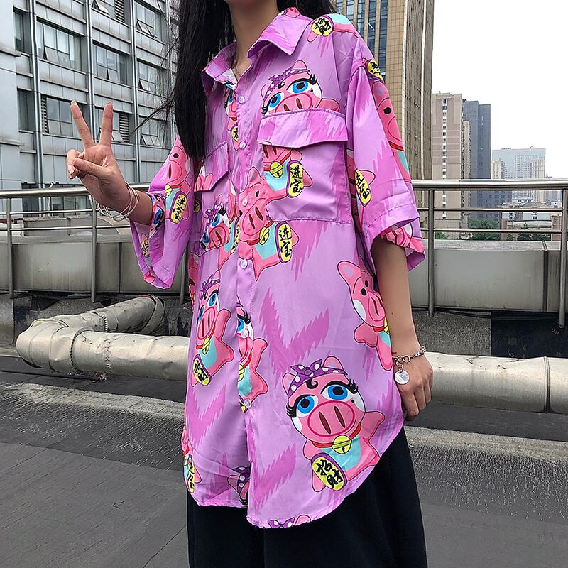 オーバーサイズシャツ レディーススタイルルーズ夏服スタンダードプリント柄Vネックトップス レトロ 大きめサイズ 夏物 CHIL66827703368