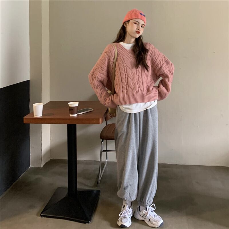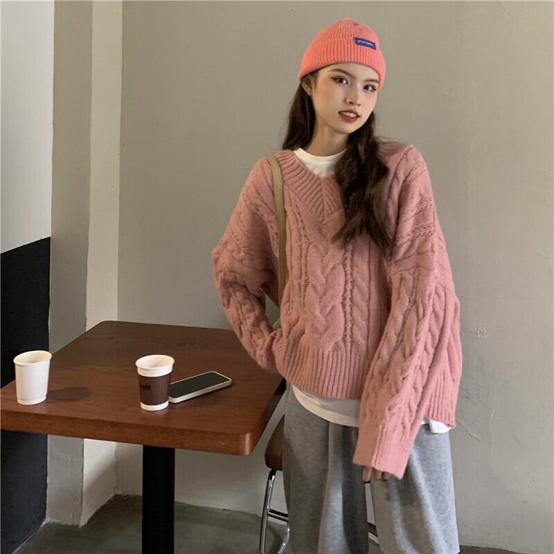 秋物スタイルルーズラウンドネック韓国ファッションVネックセーター ニット ロング オータム Oネック 長袖 CHIL42990658244