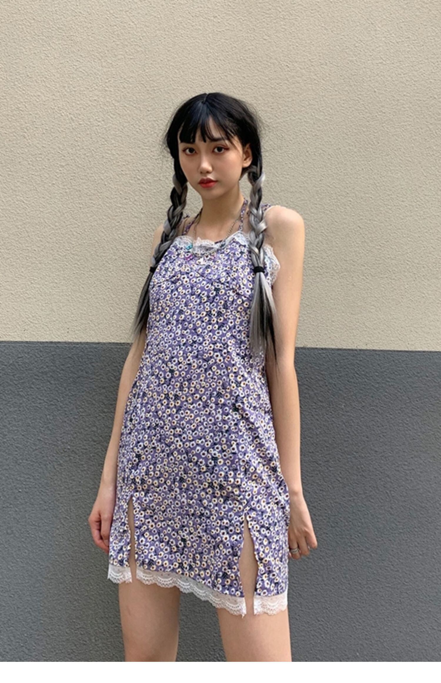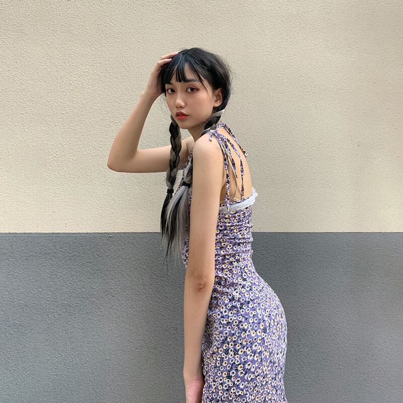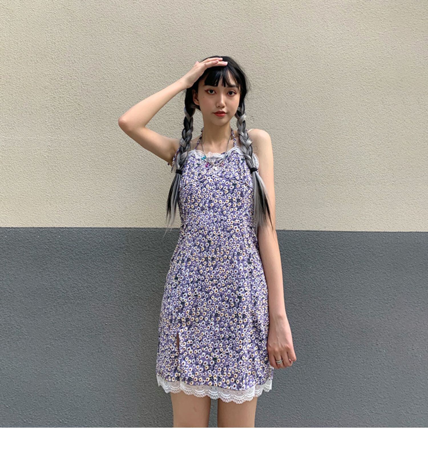 夏服韓国ファッションスタンダードワンピースショートスカート レース レトロ 夏物 パープル スタイル CHIL90500190110