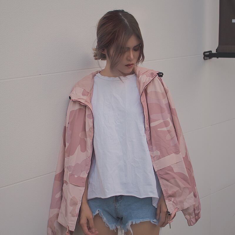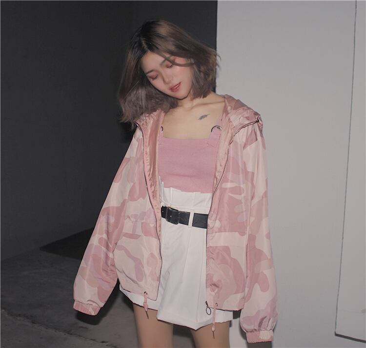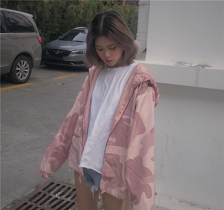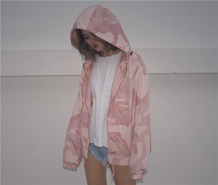 スプリング夏服韓国ファッションルーズ迷彩柄フード薄手ジャケット ロング 春物 夏物 スタイル 長袖 CHIL95457018495
