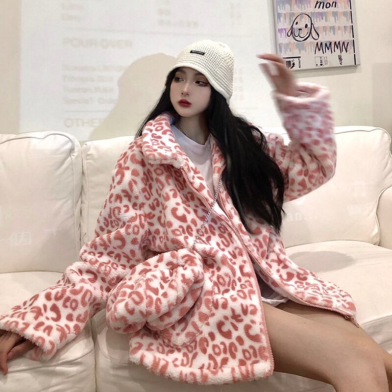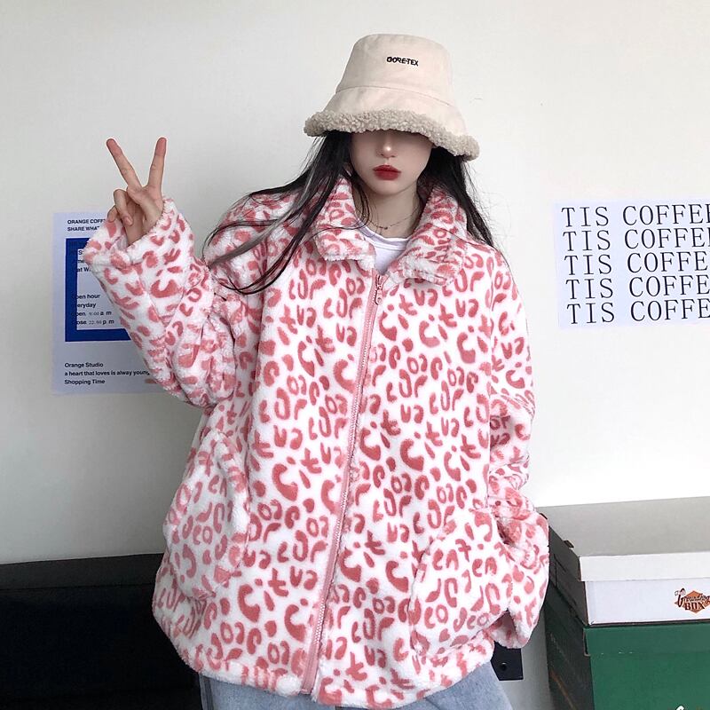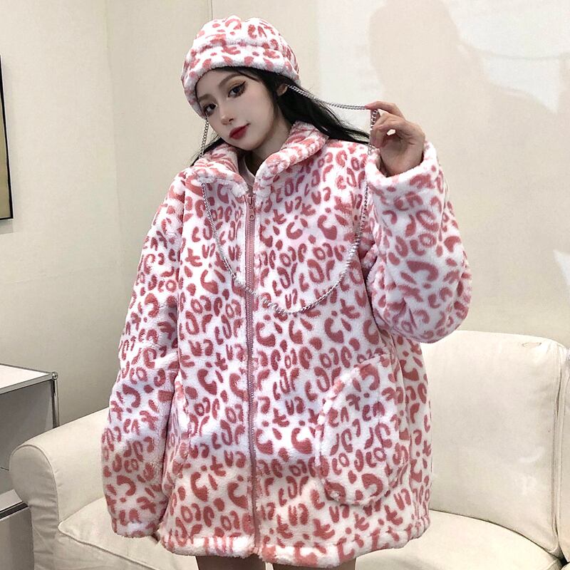 ウールコート レディーストレンド秋物ウィンター韓国ファッションルーズレオパード ピンク コットン オータム 冬物 スタイル CHIL52351922921