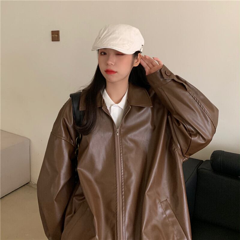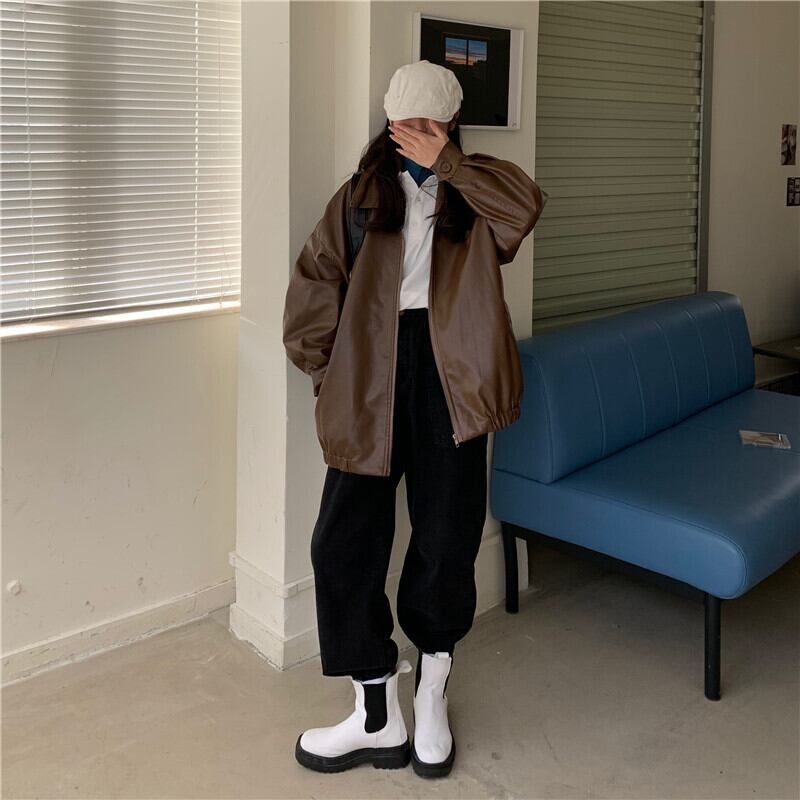 レザージャケット 秋物スタイル韓国ファッションルーズジッパースタンダードブラウンスタンドカラーカラー レトロ オータム CHIL98832783988